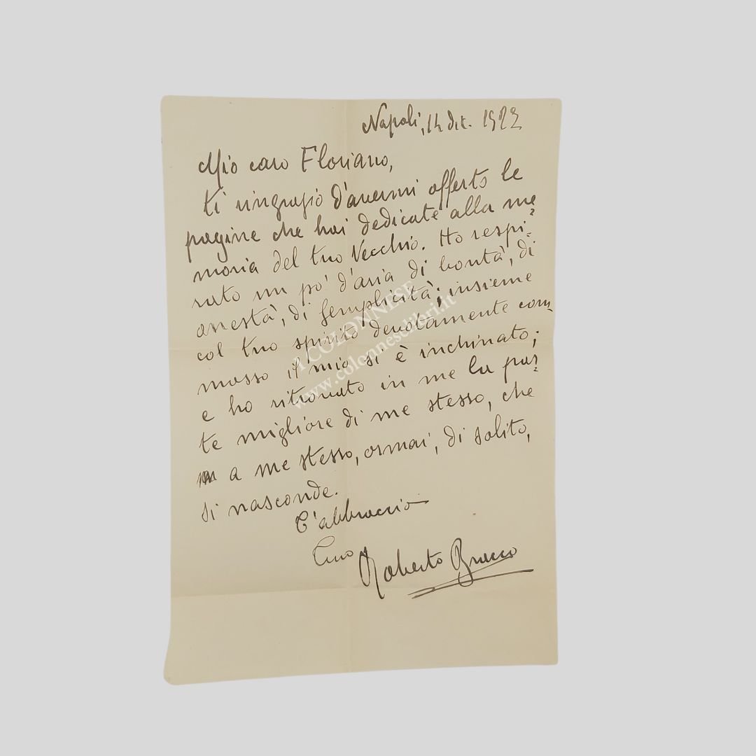 Foglio di carta (mm 310×212) manoscritto con inchiostro marrone, 14 righi, oltre la data e la firma. Lettera di ringraziamento e riflessione personale, inviata all’autorevole giornalista napoletano d’adozione, in quel periodo direttore de Il Mezzogiorno. «Mio caro Floriano, ti ringrazio di avermi offerto le pagine che hai dedicate alla memoria del tuo Vecchio […] insieme col tuo spirito devotamente commosso il mio si è inchinato; e ho ritrovato in me la parte migliore di me stesso, che a me stesso, ormai, di solito, si nasconde […]». Roberto Bracco [Napoli 1861-Sorrento 1943] Giornalista, critico drammatico e d’arte, commediografo, scrittore. Fu amico intimo di alcuni dei maggiori esponenti dell’arte partenopea, tra i quali ricordiamo Gennaro Villani, Salvatore Di Giacomo, Achille Macchia, Francesco Cangiullo, Ferdinando Russo, Edoardo Scarfoglio… I suoi lavori teatrali furono interpretati da Eleonora Duse, da Emma e Irma Gramatica. Fu spesso implicato in episodi violenti in difesa dei deboli e della giustizia. Il fondo del suo carattere rimase sempre sentimentale e lo portò a un senso caldo di amicizia anche se soffrì di una spiccata suscettibilità, soprattutto, più tardi, nei riguardi della critica, procurandosi la fama di uomo ombroso. Molto conosciuto e apprezzato all’estero, venne più volte candidato al Premio Nobel per la letteratura. Dalla desecretazione degli atti emerge che le candidature furono per gli anni che vanno dal 1922 al 1926. Nel 1922 Karl August Hagberg, traduttore di alcuni lavori di Bracco, redasse una lunga e dettagliata relazione. A causa delle sue posizioni di pacifista e di intransigente antifascista il governo italiano pose il veto sul suo nome e dopo il 1926 non fu più candidato. Sottoscrisse, unico italiano insieme a Benedetto Croce, la Déclaration de l’indépendance de l’Esprit, proposta da Romain Rolland e pubblicata sul quotidiano socialista L’Humanité il 26 giugno 1919, appello ai “lavoratori dello Spirito” a ritrovare un’unione fraterna dopo cinque anni di odio e censura. Si presentò alle elezioni del 6 aprile 1924 nelle liste promosse da Giovanni Amendola ed eletto nella circoscrizione Campania alla Camera dei deputati. Fu tra i firmatari del Manifesto degli intellettuali antifascisti, redatto nel 1925 da Benedetto Croce. Fu dichiarato decaduto dalla carica di deputato, insieme agli altri aventiniani, nella seduta del 9 novembre 1926. Nello stesso mese, in seguito al fallito attentato a Mussolini del 31 ottobre, la casa di Roberto Bracco (come pure quelle di Benedetto Croce e Arturo Labriola) venne devastata dai fascisti e un suo lavoro inedito, La verità, dato alle fiamme e irrimediabilmente perduto. Qualche tempo dopo scampò ad un agguato. Fu uno dei pochi intellettuali italiani che coerentemente non scese a patti col regime. L’ostracismo nei suoi confronti, voluto personalmente da Mussolini, si manifestò in varie forme: l’editore Mondadori rinunciò a pubblicare le sue opere, i problemi economici dovuti all’allontanamento dai palcoscenici, il divieto di espatrio. «Il manganello e l’olio di ricino gli parvero strumenti troppo vili per una rivoluzione. (…) Non patteggiò. Disdegnò gli allettamenti dell’Accademia d’Italia». <BR>Ritiratosi a Sorrento, malato e accudito dalla giovane moglie Laura, si spense il 20 aprile 1943. Della sua morte fu dato scarsissimo rilievo sui giornali. Floriano Del Secolo [Melfi, 1877-Napoli, 1949]. Giornalista, politico, scrittore colto e raffinato. Allievo di Giosué Carducci a Bologna dove visse fino ai primi anni del ‘900. Si trasferì a Napoli dove insegnò lettere e filosofia e svolse un’intensa attività giornalistica. Nel 1918 fu chiamato a condividere la direzione del quotidiano meridionalista e progressista Il Mezzogiorno. Nel 1923 dovette lasciare la direzione e e fu radiato dall’Albo dal regime fascista. Sostenne la secessione dell’Aventino e aderì all’Unione Nazionale di Giovanni Amendola, diventando presidente della sezione napoletana. Fu eletto senatore nel 1948 nelle liste del Fronte Democratico.