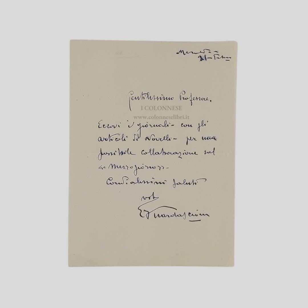 Bifolio (mm 175×129), manoscritto su una sola pagina in chiara grafia a inchiostro blu, 7 righi oltre la data e la firma. Il Guardascione si offre come collaboratore de “Il Mezzogiorno”, che Del Secolo diresse dal 1918 al 1923. In buone condizione, con tre lievi sbavature d’inchiostro e piega d’archiviazione. «Gentilissimo Professore eccovi i giornali – con gli articoli di Novelli – per una possibile collaborazione sul “Mezzogiorno” [.]».