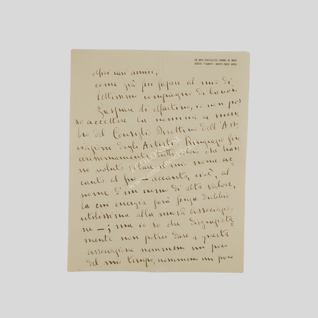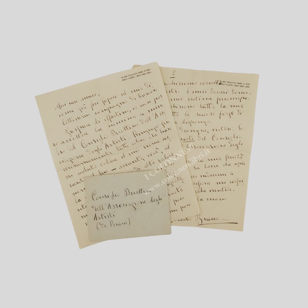 Due fogli di carta (mm 271×215) intestata dell’autore: “Via Santa Teresella degli Spagnoli-Napoli”, manoscritti, in chiara grafia, con inchiostro marrone, 34 righi, oltre la data e la firma. Lettera con la quale il B. declina la proposta di nomina a membro del Consiglio direttivo dell’Associazione degli Artisti di Napoli. «Miei cari amici, come già feci sapere al mio dilettissimo compagno di lavoro Gaspare di Martino, io non posso accettare la nomina a membro del Cosniglio Direttivo dell’Associazione degli Artisti. Ringrazio tutti coloro che hanno voluto votare il mio nome […] ma io so che disgraziatamente non potrei dare a questa associazione nemmeno un poco del mio tempo, nemmeno un poco di quel pochissimo cervello che mi resta. I miei doveri domestici e le mie intime preoccupazioni assorbiscono tutta la mia vita e tutte le scarse forze di cui ancora dispongo. Siamo dunque intesi. Io non faccio parte del Consiglio Direttivo dell’Associazione degli Artisti […] ogni cortese insistenza per indurmi a mutare la mia decisione mi riuscirebbe dolorosa e inutile […]». Roberto Bracco [Napoli 1861-Sorrento 1943] Giornalista, critico drammatico e d’arte, commediografo, scrittore. Fu amico intimo di alcuni dei maggiori esponenti dell’arte partenopea, tra i quali ricordiamo Gennaro Villani, Salvatore Di Giacomo, Achille Macchia, Francesco Cangiullo, Ferdinando Russo, Edoardo Scarfoglio… I suoi lavori teatrali furono interpretati da Eleonora Duse, da Emma e Irma Gramatica. Fu spesso implicato in episodi violenti in difesa dei deboli e della giustizia. Il fondo del suo carattere rimase sempre sentimentale e lo portò a un senso caldo di amicizia anche se soffrì di una spiccata suscettibilità, soprattutto, più tardi, nei riguardi della critica, procurandosi la fama di uomo ombroso. Molto conosciuto e apprezzato all’estero, venne più volte candidato al Premio Nobel per la letteratura. Dalla desecretazione degli atti emerge che le candidature furono per gli anni che vanno dal 1922 al 1926. Nel 1922 Karl August Hagberg, traduttore di alcuni lavori di Bracco, redasse una lunga e dettagliata relazione. A causa delle sue posizioni di pacifista e di intransigente antifascista il governo italiano pose il veto sul suo nome e dopo il 1926 non fu più candidato. Sottoscrisse, unico italiano insieme a Benedetto Croce, la Déclaration de l’indépendance de l’Esprit, proposta da Romain Rolland e pubblicata sul quotidiano socialista L’Humanité il 26 giugno 1919, appello ai “lavoratori dello Spirito” a ritrovare un’unione fraterna dopo cinque anni di odio e censura. Si presentò alle elezioni del 6 aprile 1924 nelle liste promosse da Giovanni Amendola ed eletto nella circoscrizione Campania alla Camera dei deputati. Fu tra i firmatari del Manifesto degli intellettuali antifascisti, redatto nel 1925 da Benedetto Croce. Fu dichiarato decaduto dalla carica di deputato, insieme agli altri aventiniani, nella seduta del 9 novembre 1926. Nello stesso mese, in seguito al fallito attentato a Mussolini del 31 ottobre, la casa di Roberto Bracco (come pure quelle di Benedetto Croce e Arturo Labriola) venne devastata dai fascisti e un suo lavoro inedito, La verità, dato alle fiamme e irrimediabilmente perduto. Qualche tempo dopo scampò ad un agguato. Fu uno dei pochi intellettuali italiani che coerentemente non scese a patti col regime. L’ostracismo nei suoi confronti, voluto personalmente da Mussolini, si manifestò in varie forme: l’editore Mondadori rinunciò a pubblicare le sue opere, i problemi economici dovuti all’allontanamento dai palcoscenici, il divieto di espatrio. «Il manganello e l’olio di ricino gli parvero strumenti troppo vili per una rivoluzione. (…) Non patteggiò. Disdegnò gli allettamenti dell’Accademia d’Italia». Ritiratosi a Sorrento, malato e accudito dalla giovane moglie Laura, si spense il 20 aprile 1943. Della sua morte fu dato scarsissimo rilievo sui giornali.