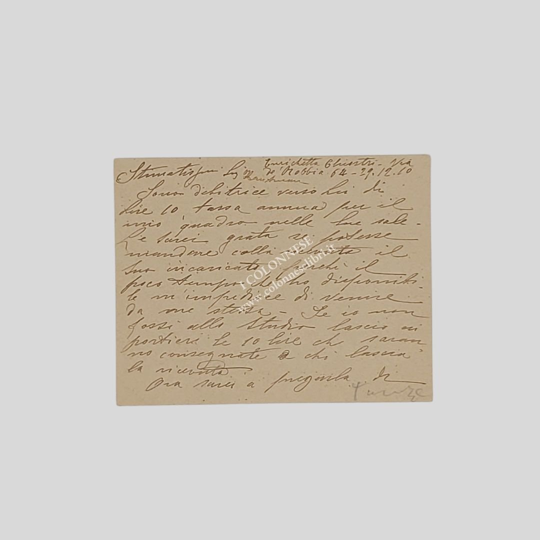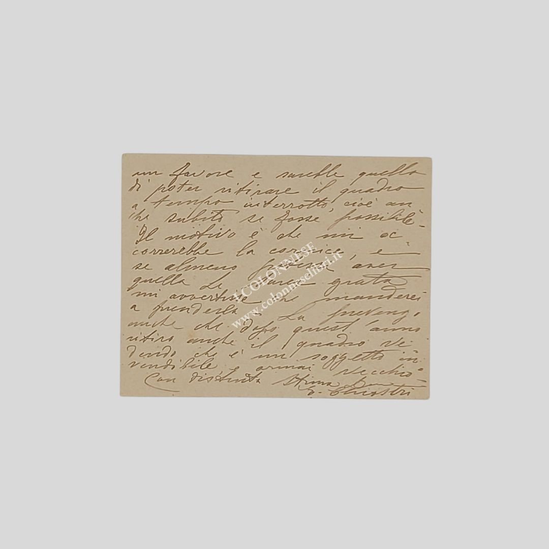 Illeggibile il destinatario (un gallerista fiorentino?). Cartoncino (mm 115×90), manoscritto al recto-verso con inchiostro marrone, 30 righi, oltre la firma e la data. La pittrice fiorentina comunica che è pronta a saldare il dovuto per la tassa annua per uun suo quadro esposto e chiede la restituzione di due quadri. «Sono debitrice verso Lei di Lire 10, tassa annua per il mio quadro nelle Sue sale. Le sarei grata se potesse mandare colla ricevuta il Suo incaricato, perché il poco tempo che ho disponibile m’impedisce di venire da me stessa. Se io non fossi nello Studio lascio ai portieri le 10 lire che saranno consegnate a chi lascia la ricevuta. Ora sarei a pregarla di un favore e sarebbe quello di poter ritirare il quadro a tempo interrotto, cioè anche subito se fosse possibile. Il motivo è che mi occorrerebbe la cornice e se almeno potessi avere quella Le sarei grata mi avvertisse […] Dopo quest’anno ritiro anche il quadro Vedendo che è un soggetto invendibile e ormai vecchio […]». Enrichetta Chiostri (Firenze 1860-ivi 1942). Pittrice. Frequenta l’Accademia delle Belle Arti di Firenze tra il 1890 e il 1892. La sua produzione artistica comprende nature morte, paesaggi e soprattutto soggetti floreali. Nel 1904, partecipò all’Esposizione Italiana “Italian Exhibition Earl’s Court” a Londra, organizzata dalla Camera di Commercio. Nel 1914 espone alla Biennale di Venezia con un quadro intitolato Fiori. Una delle sue composizioni floreali è esposta nel Palazzo del Quirinale a Roma.