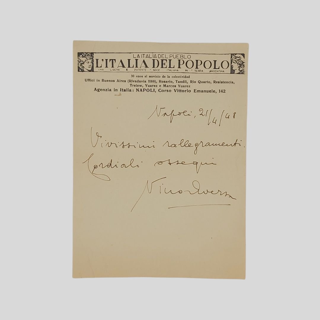 Manoscritto a inchiostro marrone, su carta intestata (mm 207x153) della giornale argentino "La Italia del Pueblo/L'Italia del Popolo". Due righi, oltre la data "21/4/1948" e la firma: «Vivissimi rallegramenti. Cordiali ossequi». Alcune pieghe di archiviazione ma in buone condizioni. Il giornalista e scrittore si congratula con Floriano Del Secolo per la sua elezione a senatore (30.073 voti) nella lista del Fronte Democratico (Collegio di Torre del Greco) alle prime elezioni repubblicane dell'aprile del 1948. Nino Aversa, giornalista e scrittore pubblicò, tra l'altro: Napoli sotto il terrore tedesco. Contributo alla storia degli avvenimenti dall'Armistizio alla Liberazione. <BR>Nino Aversa, giornalista e scrittore. Collaboratore di Del Secolo nella redazione de "Il Risorgimento", primo quotidiano di "Napoli liberata", pubblicò, tra l'altro: Napoli sotto il terrore tedesco. Contributo alla storia degli avvenimenti dall'Armistizio alla Liberazione. Napoli, Le quattro giornate, 1943.