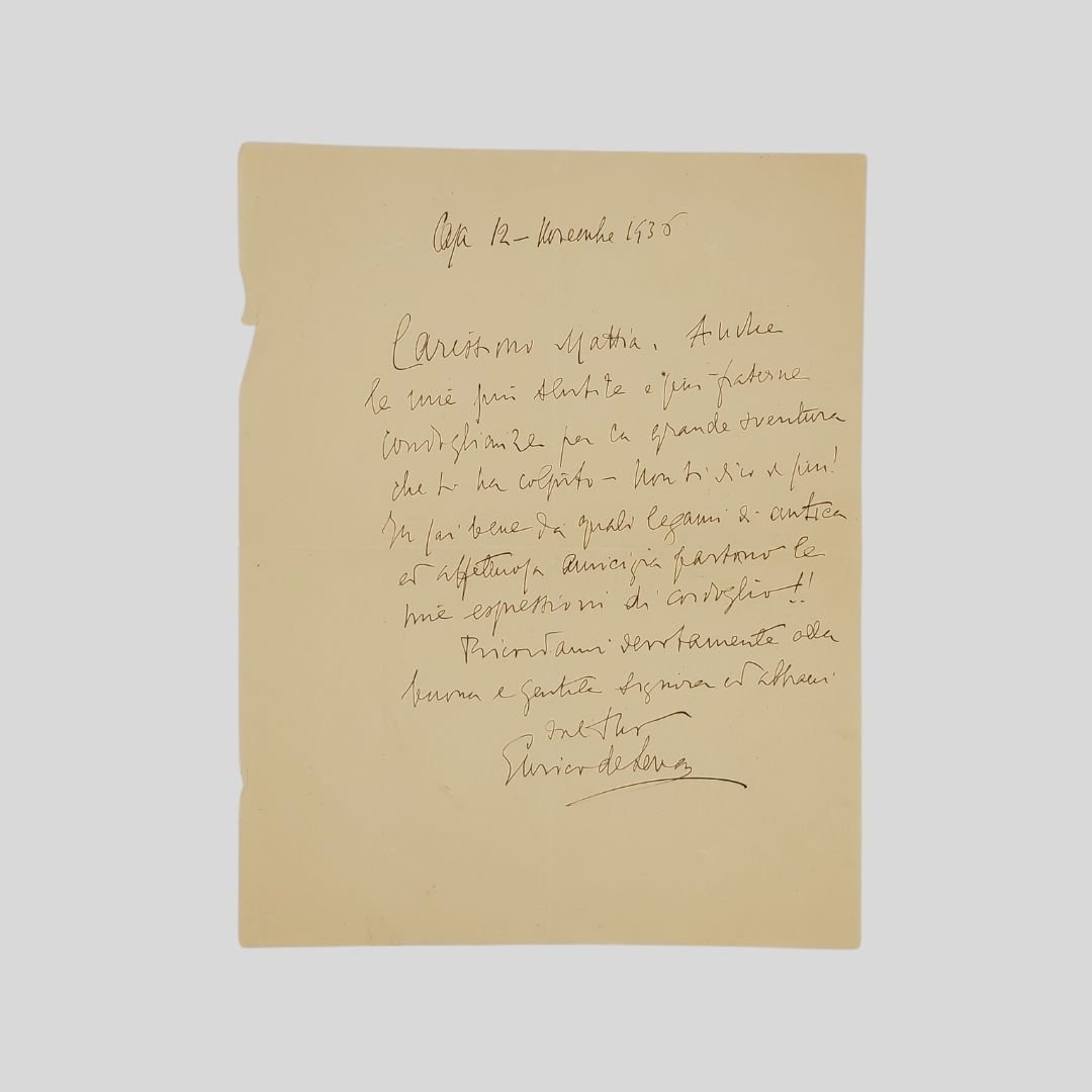 Foglio (mm 290×225) manoscritto a inchiostro seppia di 10 righi oltre la data e la firma. Rara lettera personale di Enrico de Leva, celebre compositore e pianista, il cui materiale autografo è di difficile reperibilità sul mercato. Il contenuto esprime sentimenti di profonda amicizia e affetto, offrendo uno spaccato sulla personalità dell’autore al di fuori della sua attività musicale. Insignificanti tracce d’uso. In buone condizioni.«Carissimo Mattia […] le mie più sentite e più fraterne condoglianze per la grande sventura che ti ha colpito […]». Il destinatario molto probabilmente è Mattia Limoncelli. Entrambi in quel periodo erano tra gli artefici del Circolo Artistico Politecnico. Enrico de Leva (Napoli 1867 – Napoli 1955) pianista e compositore. Nel 1915 ebbe la cattedra di canto al Conservatorio di S. Pietro a Majella. Iniziò giovanissimo a comporre canzoni napoletane, cui si dedicò per tutto l’arco della sua esistenza e alle quali è legata la sua fama. Compose anche l’opera in quattro atti La Camargo, rappresentata al Teatro Regio di Torino nel 1898 sotto la direzione di Arturo Toscanini, e successivamente al Teatro San Carlo di Napoli. Nel 1908 fu a Londra per un’acclamata tournée di concerti insieme con F. P. Tosti. Nel 1907 successe a N. D’Arienzo come direttore artistico dell’istituto musicale dei Ss. Giuseppina e Lucia di Napoli. Particolarmente significativo fu il sodalizio artistico stabilito con Salvatore Di Giacomo, dalla cui collaborazione nacque, tra le altre, forse la più celebre delle sue canzoni, la gustosa e ironica ‘E spingole frangese. Non meno proficua fu la collaborazione con Roberto Bracco, il quale nel 1908 pubblicò una raccolta di testi poetici Vecchi versetti, che offrì al D. vari spunti d’ispirazione per la sua produzione di canzoni: da essa nacquero canzoni ispirate a canti tradizionali come‘O munaciello e‘Nù passariello sperzo (1901). La sua arte, maturata nella Napoli fin de siècle, trovò il suo ambiente ideale nel clima spumeggiante e raffinato del salone Margherita, il più elegante café chantant partenopeo, ove riviveva la spensierata atmosfera parigina. Rallentata l’attività negli anni che precedettero la seconda guerra mondiale, la interruppe completamente a partire dal 1943 in seguito alla tragica fine dell’unico figlio Rosario, trucidato a soli diciotto anni dai tedeschi a Faicchio (Benevento) ove la famiglia risiedette durante la guerra. Mattia Limoncelli [Napoli 1880-Napoli 1966]. Scrittore e Avvocato, noto per le sue arringhe. Deputato dal 1929 al 1934 (XXVIII Legislatura) per il Partito Nazionale Fascista, è stato autore di numerose raccolte poetiche. Fu nominato Presidente dell’Accademia di Belle Arti di Napoli e del Circolo Artistico Politecnico.