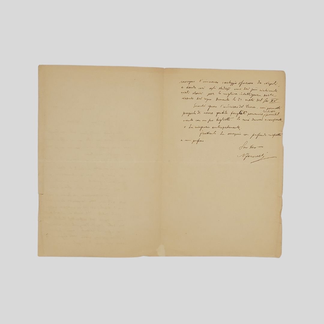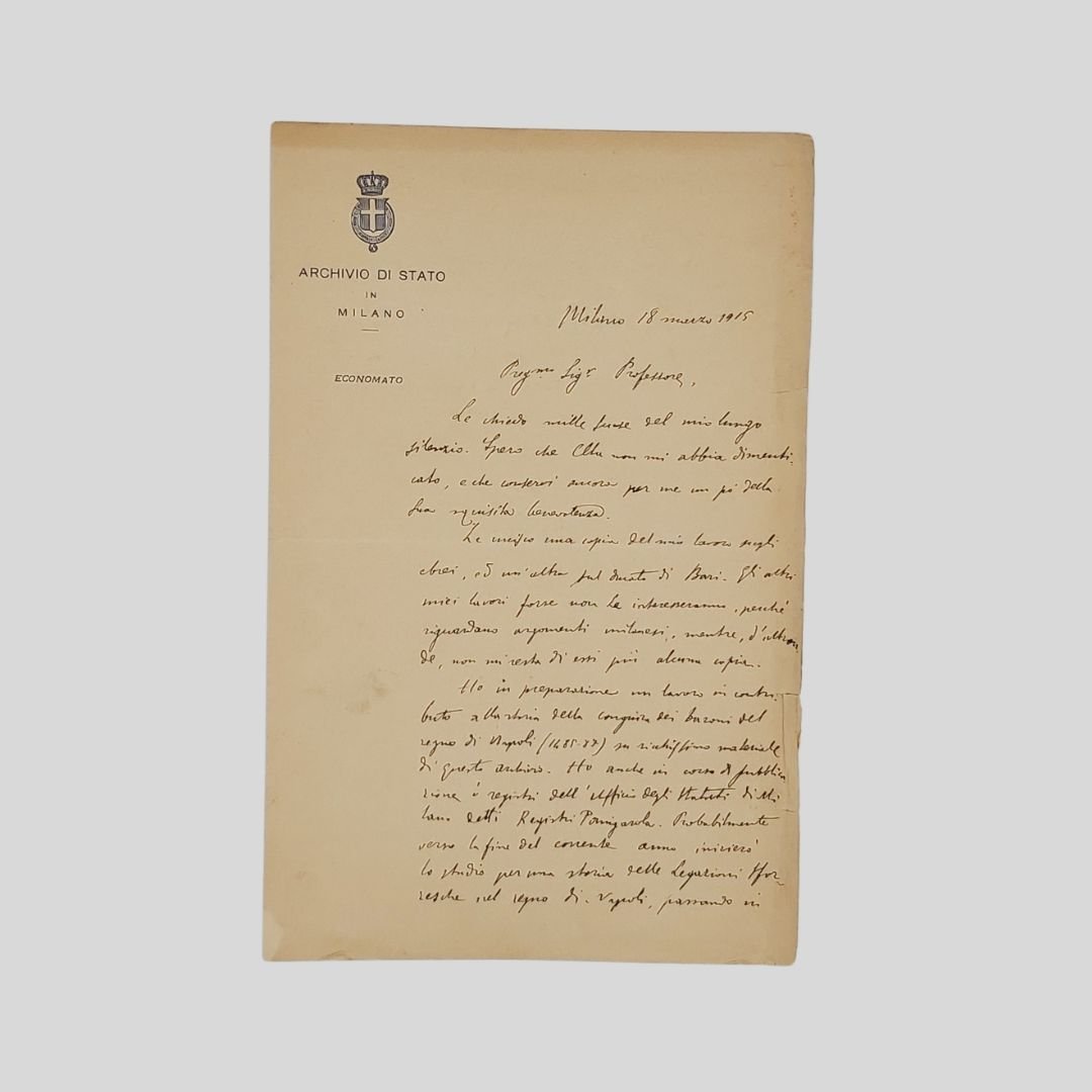 Bifolio in carta vergata con filigrana, intestata “Archivio di Stato in Milano”, mm 220×143. Manoscritto con inchiostro nero, righi 29, oltre la data e la firma. Piegature di archiviazione e tracce d’uso marginali. Il F. comunica al D. l’invio di due sue pubblicazioni Gli ebrei nell’Italia meridionale e Il ducato di Bari sotto Sforza Maria Sforza e Ludovico il Moro e la preparazione di un contributo alla Storia della Congiura dei baroni del Regno di Napoli (1485-87) “grazie al ricchissimo materiale presente nell’archivio di Stato di Milano” e che ha in corso di pubblicazione i Registri dell’Archivio Panigarola e che ha in procinto di iniziare uno studio “per una storia delle legazioni sforzesche nel Regno di Napoli”. Inoltre chiede di consegnare copia delle pubblicazioni a Benedetto Croce di cui ignora l’indirizzo. «Le chiedo mille scuse del mio lungo silenzio […] Le unisco una copia del mio lavoro sugli ebrei¹ ed un’altra sul ducato di Bari². Gli altri miei lavori forse non Le interesseranno perche riguardano argomenti milanesi […] Ho in preparazione un lavoro, un contributo alla storia della congiura dei baroni del regno di Napoli (1485-87) sul ricchissimo materiale di questo archivio. Ho anche in corso di pubblicazione i registri dell’Ufficio degli Statuto di Milano detti Registri Panigarola […] Verso la fine dell’anno corrente inizierò lo studio per una storia delle Legazioni sforzesche nel regno di Napoli, passando in rassegna l’immenso carteggio sforzesco di Napoli, e dando così agli studiosi uno dei più ricchi materiali storici per la migliore intelligenza delle vicende del regno durante la seconda metà del sec. XV. Giacché ignoro l’indirizzo del Croce, mi permetto pregarla di essere gentile fargli pervenire l’unita copia, possibilmente con un suo biglietto. Le sarò davvero riconoscente e la ringrazio anticipatamente [.]». ¹Il suo studio più impegnativo Gli ebrei nell’ Italia meridionale dall’ età romana al secolo XVIII, Torino, 1915 rimane tuttora fondamentale, e suscitò discussioni autorevoli, con interventi puntuali, come quelli di G. Luzzatto e Umberto Cassuto. Nel 1938, in un momento drammatico della storia degli ebrei in Italia, B. Croce, rievocando l’atteggiamento di tolleranza che distinse la dinastia aragonese di Napoli, segnalava a questo riguardo l’importanza delle ricerche documentarie e dell’opera del Ferorelli, riproponendo nel medesimo tempo lo spirito e la cultura da cui esse erano state dettate (cfr. Un‘epistola del Galateo in difesa degli ebrei, in Aneddoti).<BR><BR>²Il ducato di Bari sotto Sforza Maria Sforza e Ludovico il Moro. In: Archivio storico lombardo. Giornale della Società storica lombarda , Anno 41 (parte seconda), fasc. 3 (1914), p. 389 – 468.<BR><BR>Nicola Ferorelli [Bitetto, Bari 1877 – Milano 1951] Compì i suoi studi a Napoli. Quasi trentenne cominciò a lavorare negli archivi di Stato e dal 1906 presso l’Archivio di Stato di Milano. Lì consolidò il proprio interesse per lo studio della storiaI. Il F. in quegli anni avviava – sulla scia probabilmente degli studi universitari napoletani – una fervida attività di ricerca relativa alla condizione e alle vicende degli ebrei nell’Italia meridionale nel Medioevo e nell’età moderna. Proprio al periodo 1906-1907 risalgono i suoi primi lavori sull’argomento, che risentono con evidenza della temperie culturale dell’epoca: ad animare l’interesse storico meridionale alla presenza ebraica nel Mezzogiorno era infatti, fra Otto e Novecento, il convincimento che l’espulsione degli ebrei dal Regno, nel 1541, fosse da assumere come una delle cause principali della mancata formazione di un ceto mercantile. In particolare tali contributi erano dedicati alla biografia e alla famiglia di un celebre medico leccese morto nel 1523, Abramo De Balmes, sul quale non si avevano che notizie insufficienti ed imprecise; all’immigrazione degli ebrei spagnoli nel Napoletano al tempo di Ferdinando il Cattolico; al “Segno” degli Ebrei e il popolino napoletano, con riferimento ai provvedimenti adottati dal re di Napoli e Sicilia Carlo di Borbone; e all’attività dei tipografi e dei librai ebrei alla fine del Quattrocento. Contemporaneamente cominciava a pubblicare nell’Archivio storico per le province napoletane un profilo organico su Gli ebrei nell’Italia meridionale dall’età romana a Carlo di Borbone, non portato a termine, confluito poi, nel 1915, nel volume edito a Torino per iniziativa della rivista Il Vessillo israelitico col titolo Gli ebrei nell’Italia meridionale dall’età romana al secolo XVIII (rist. anast. Bologna 1966; nuova ediz. a c. di F. Patroni Griffi, Napoli 1990). L’attività scientifica proseguì con un volume sugli statuti milanesi del Trecento, frutto della collazione di un codice allora acquisito dall’Amministrazione con quelli già custoditi negli archivi, e con un saggio sul Ducato di Bari sotto il dominio sforzesco, che si avvale della documentazione esistente nell’Archivio milanese ai fini della storia del Regno, secondo il suggerimento offerto ai discepoli da M. Schipa. Floriano Del Secolo [Melfi, 1877-Napoli, 1949]. Giornalista, politico, scrittore colto e raffinato. Allievo di Giosué Carducci a Bologna dove visse fino ai primi anni del ‘900. Si trasferì a Napoli dove insegnò lettere e filosofia e svolse un’intensa attività giornalistica. Nel 1918 fu chiamato a condividere la direzione del quotidiano meridionalista e progressista Il Mezzogiorno. Nel 1923 dovette lasciare la direzione e e fu radiato dall’Albo dal regime fascista. Sostenne la secessione dell’Aventino e aderì all’Unione Nazionale di Giovanni Amendola, diventando presidente della sezione napoletana. Su indicazione di Benedetto Croce, fu nominato direttore del quotidiano Il Risorgimento (1944) – primo quotidiano di Napoli liberata – in cui confluirono le testate de Il Mattino, del Roma e del Corriere di 