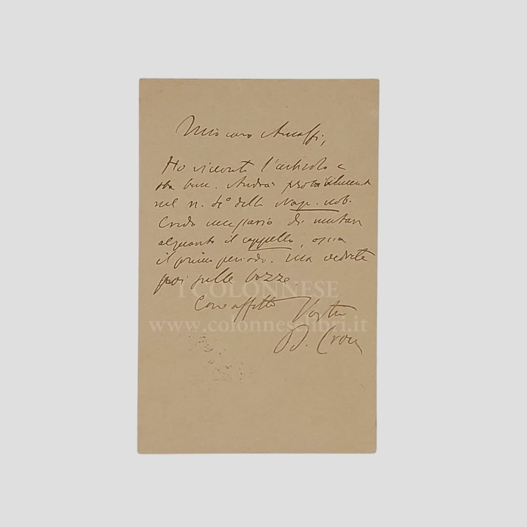 Manoscritta a inchiostro nero, 10 righi oltre la firma, senza data, su cartolina postale (mm 140×90) viaggiata, francobollo e timbro, postalizzata il 13/3/1895. In buone condizioni. «Mio caro Amalfi, Ho ricevuto l’articolo¹ e va bene. Andrà probabilmente nel n. 4° della Nap. Nob. Credo di mutare alquanto il cappello ossia il primo periodo. Ma vedrete poi nelle bozze. Con affetto […]». ¹Probabilmente si riferisce all’articolo "La fossa del coccodrillo in Castelnuovo", pubblicato in Napoli nobilissima, vol. IV, 1895, fasc. XI, pp. 97-102.