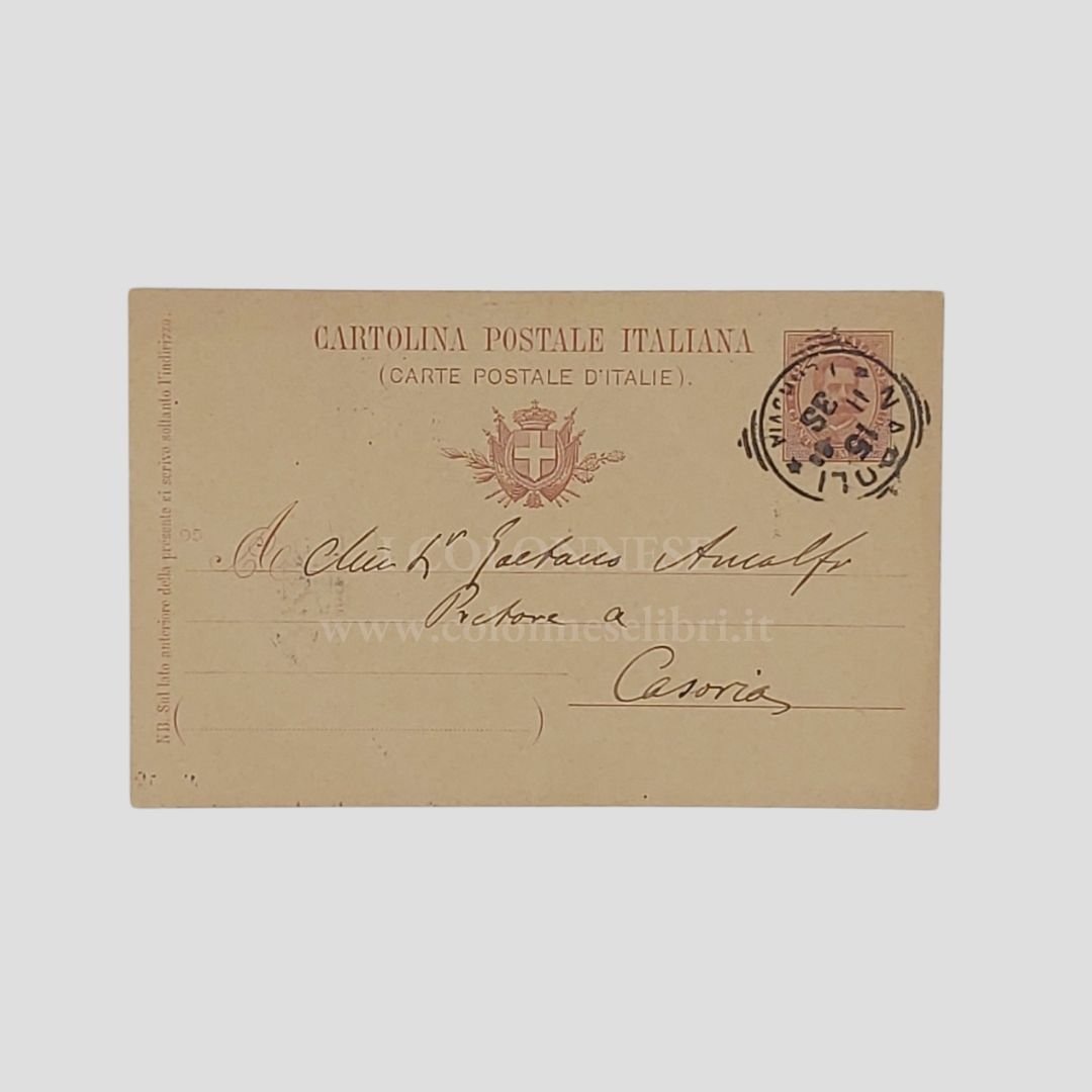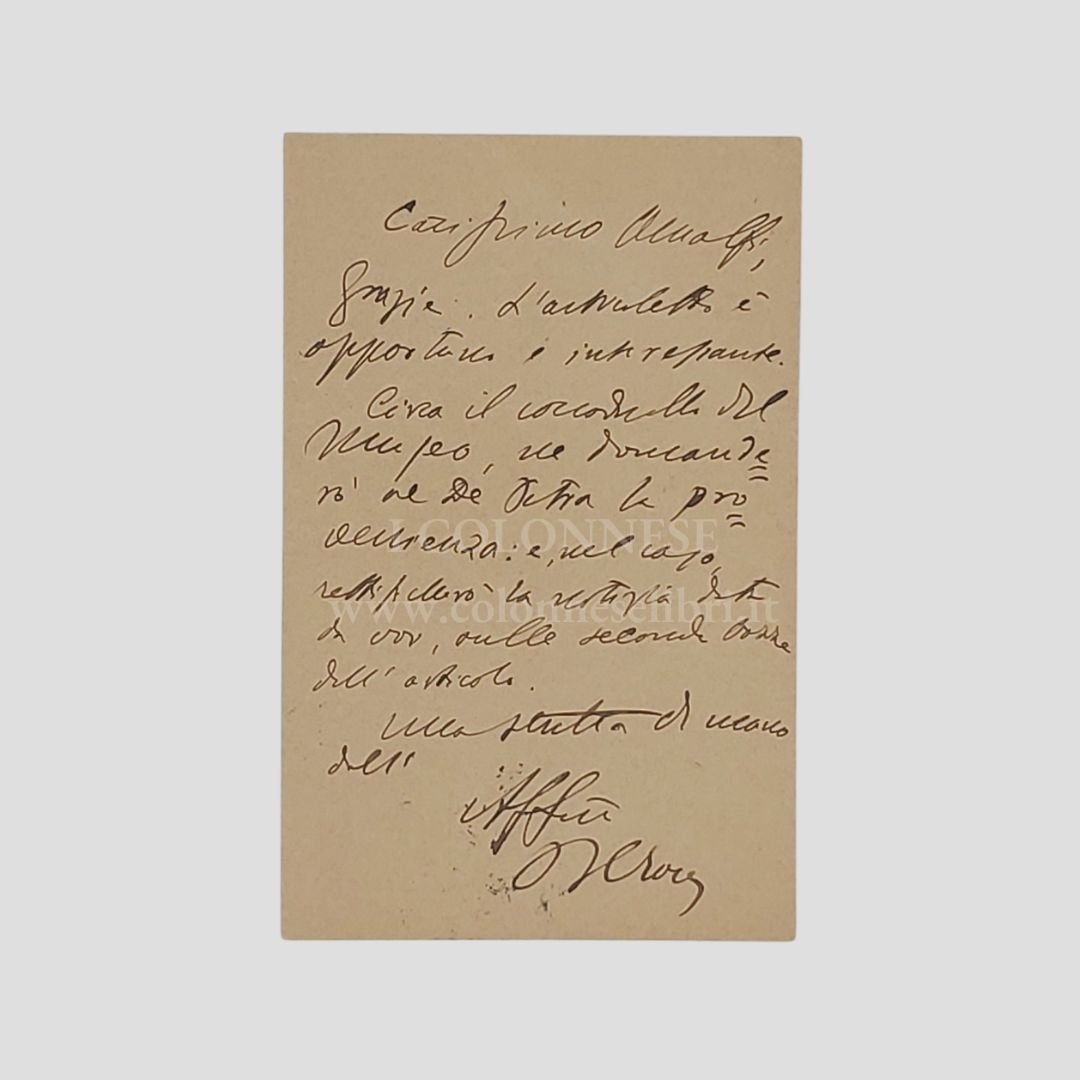 Manoscritta a inchiostro nero, 13 righi oltre la firma, senza data, su cartolina postale (mm 140×90) viaggiata, francobollo e timbro postale (non leggibile). «Carissimo Amalfi, Grazie. L’articoletto è opportuno e interessante. Circa il coccodrillo del Museo ne domanderò al De Petra [Giulio, direttore del Museo Nazionale, n.d.c.] la provenienza: e, nel caso, rettificherò la notizie sulle seconde bozze dell’articolo. Una stretta di mano». L’articolo "La fossa del coccodrillo in Castelnuovo" fu pubblicato in Napoli nobilissima, vol. IV, 1895, fasc. XI, pp. 97-102.