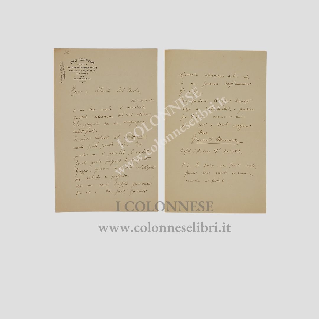 Bifolio intestato The Express Impresa Fattorini Commissionari (mm 219×134) manoscritto a inchiostro marrone e la data 'Napoli 18 dic. 1919'. Interessante e rara missiva nella quale il M. propone, al direttore de Il Mezzogiorno, la recensione di un suo libro [Difesa di Dulcinea]. In ottime condizioni. «Caro e illustre Del Secolo, mi ricordo di un suo invito a mandarle qualche recensione del mio ultimo libro¹, eseguita da un compagno intelligente. Io avrei preferito sul Mezzogiorno anche poche parole sue. Ma poiché non è possibile, Le accludo queste poche pagine di Augusto Guzzo², giovane non solo intelligente ma dotato e profondo. Esse non sono troppo generose per me. Non può quindi apparire nemmeno a Lei che io mi procuri dagli amici gli elogi. Mi perdoni se ogni tanto vengo a disturbarla, e gradisca per il nuovo anno i miei più vivi e devoti auguri. Suo Gherardo Marone. p.s. Le scrivo su questa carta perché sono venuto invano a cercarla al giornale».¹ Gherardo Marone, Difesa di Dulcinea, Napoli: Libreria della Diana, 1920, 186 p. [Al colophon: Finito di stampare il 28 settembre 1919]. ²Augusto Guzzo (Napoli 1894 – Torino 1986) è stato un filosofo italiano. Laureatosi nel 1915 con una tesi sui primi scritti di Kant, iniziò a insegnare nel 1918 presso il liceo Plinio Seniore di Castellammare di Stabia, dove rimase per sei anni, prima di passare alla carriera universitaria. Dal 1926 fu professore di filosofia e storia della filosofia al Magistero di Torino.