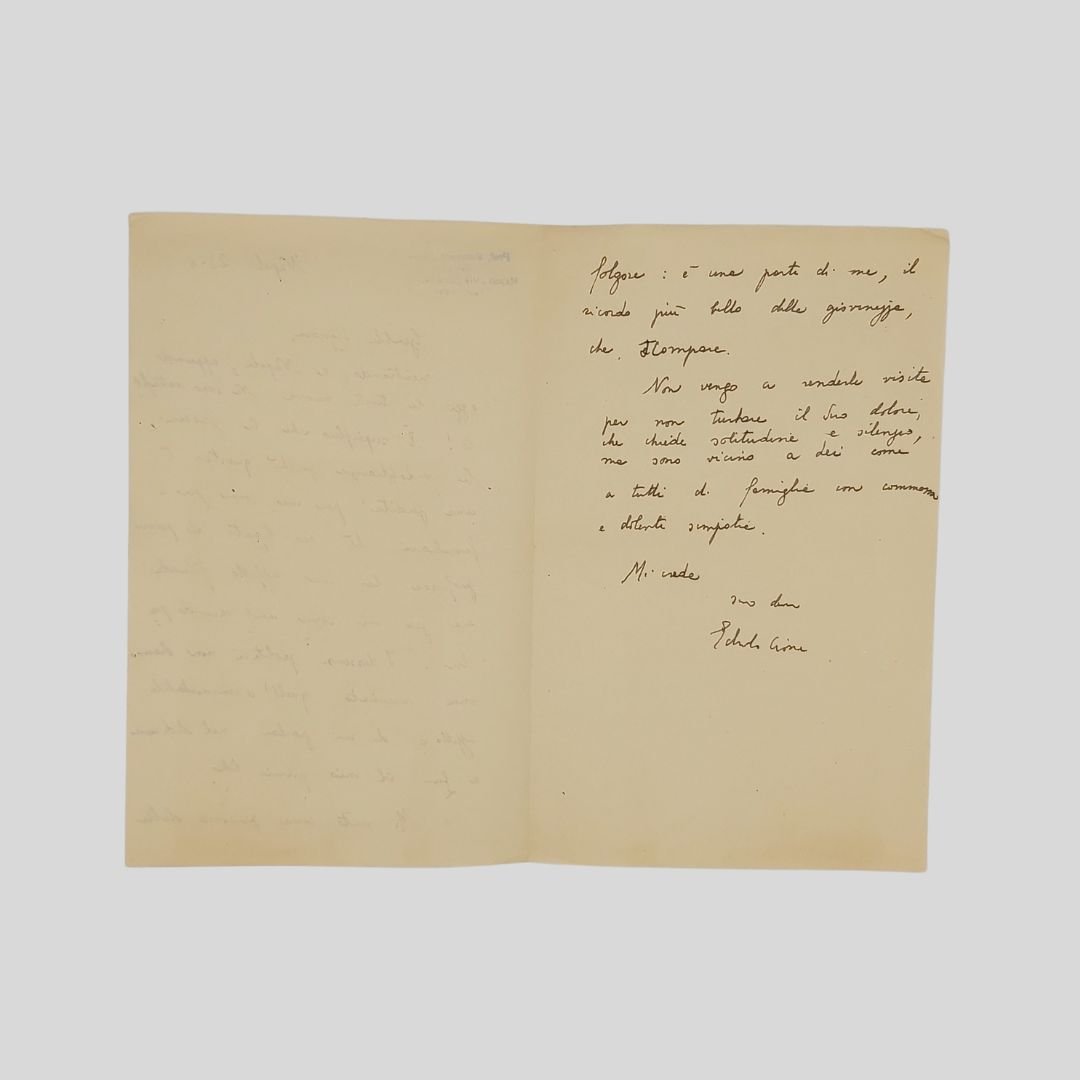 Bifolio (mm 143×226), con timbro d’intestazione a inchiostro blu «Prof. Edmondo Cione dell’Università». Manoscritto a inchiostro nero, righi 25 oltre la data e la firma. Missiva di condoglianze dello storico antifascista che successivamente aderì alla Repubblica di Salò, per la scomparsa dell’importante giornalista, scrittore e politico lucano, allievo di Giosuè Carducci e stretto collaboratore di Benedetto Croce. In ottime condizioni. «Gentile Signora, rientrando a Napoli, apprendo oggi la triste nuova. Ne sono esterefatto! È superfluo che le faccia le condoglianze perché questa è una perdita per me come per i familiari ché ero legato al povero professore da un affetto filiale: era per me come un secondo padre. I dissensi politici non hanno mai incrinato quell’immutabile affetto di cui parlai nel dedicare a lui il mio primo libro […]». <BR>Domenico Edmondo Cione (Napoli 1908 – Ivi 1965) è stato uno storico della filosofia, politico e critico letterario italiano, bibliotecario alla Nazionale di Firenze e alla Braidense di Milano. Di tendenze socialiste e in un primo momento antifasciste, fu introdotto in casa Croce da Floriano Del Secolo, ne accettò pienamente le idee e divenne suo allievo, attirandosi con la sua prima pubblicazione “Il dramma religioso dello spirito moderno e la Rinascenza” (Napoli 1929 ), in cui prese posizione contro il Gentile, gli attacchi violenti dei coetanei fascisti. Perseguitato della prima ora dal fascismo, viene rinchiuso nel campo di Colfiorito di Foligno e poi mandato al confino a Montemurro. Attratto dal nuovo indirizzo espresso dal “Manifesto di Verona”, aderisce alla Repubblica Sociale Italiana. Nel dopoguerra subì per un brevissimo periodo l’epurazione dal mondo scolastico, definita da lui stesso meno dura del previsto, venendo reintegrato nel 1946 come professore e nel 1948 riammesso al servizio universitario a Napoli. Si costruirà una carriera politica nell’Italia repubblicana, militando dal 1946 al 1949 nel Fronte dell’Uomo Qualunque; successivamente, quando il partito di Guglielmo Giannini si sciolse, entrò nel Movimento Sociale Italiano e nel 1952 venne eletto consigliere comunale a Napoli e poi assessore della giunta di Achille Lauro. Nel 1953 si candidò al Senato con la lista della fiamma nel collegio di Afragola ma ottenne il 7.8% dei voti e non fu eletto. Deluso dai missini, aderì alla Democrazia Cristiana, senza però svolgere una militanza attiva nel partito. Negli ultimi anni di vita cercò di conciliare il messaggio di papa Giovanni XXIII con le aperture di Nikita Chrušcëv oltre la “cortina di ferro”, durante il periodo del “disgelo”. Floriano Del Secolo (Melfi, 1877-Napoli, 1949). Letterato e giornalista italiano, allievo, a Bologna, del Carducci, prof. di lettere e filosofia nel Collegio militare di Napoli, città in cui svolse anche, fino all’avvento del fascismo, una notevole attività giornalistica. Tra il 1918 e il 1923 fu condirettore e poi direttore del quotidiano “Il Mezzogiorno”. Durante il regime fascista fu privato della cattedra alla Scuola Militare “Nunziatella”, allontanato dalla direzione del giornale e radiato dall’Albo dei giornalisti. Aderì e promosse l’Unione napoletana democratica, costituita da Giovanni Amendola, e fu tra i firmatari nel 1925 del «Manifesto degli intellettuali antifascisti» di Benedetto Croce, con cui intrattenne una stretta collaborazione. Nel dopoguerra, su proposta del filosofo, fu nominato direttore del “Risorgimento”, in cui confluirono nel 1943, dopo la liberazione della città, le testate “Il Mattino”, “Roma” e “Corriere di Napoli”. Aderì nel 1947 al Fronte Democratico del Mezzogiorno e fu eletto nel 1948 senatore quale indipendente nelle liste del Fronte Democratico Popolare. Morì a Napoli il 20 giugno 1949.