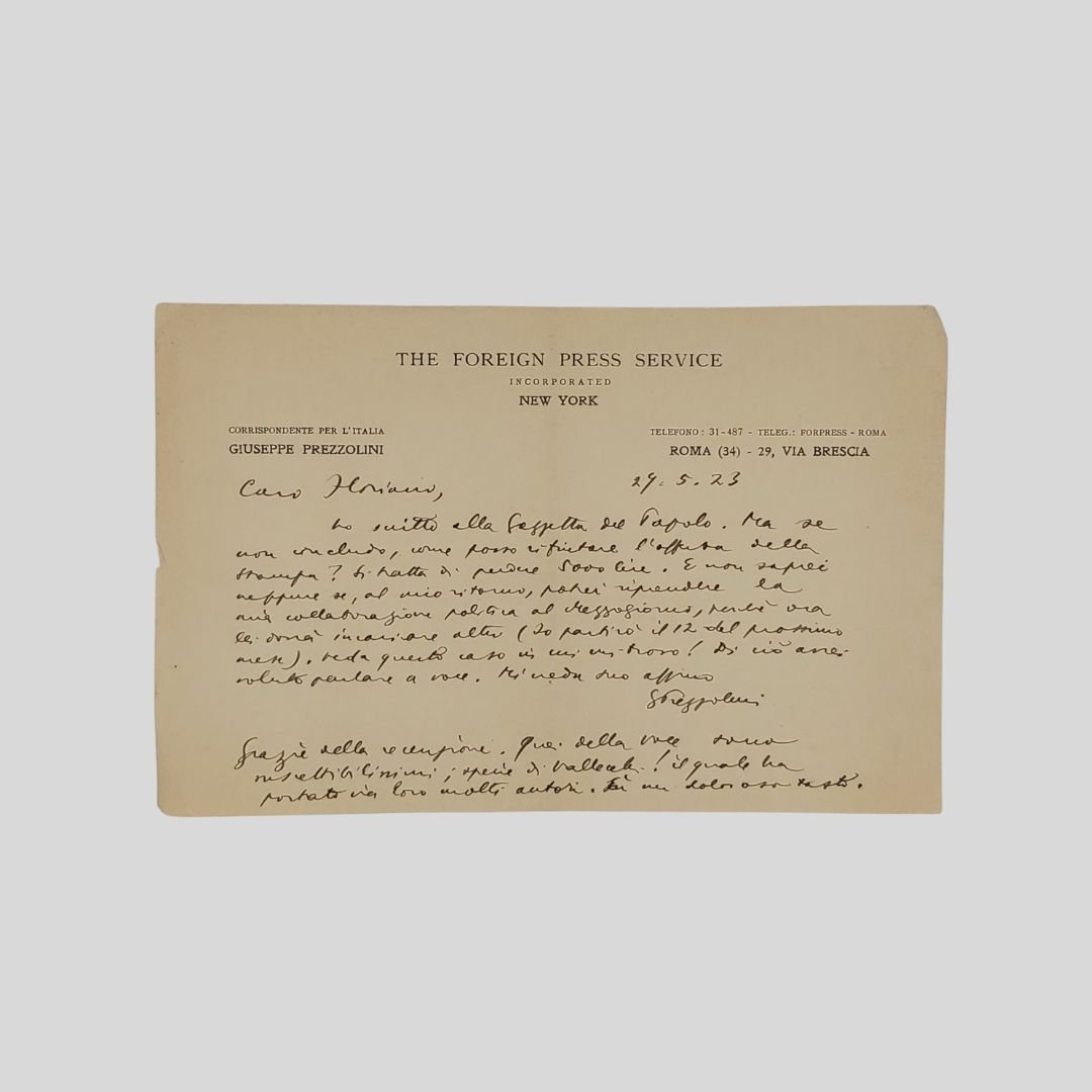 Foglio manoscritto (mm 145×22) solo al recto con inchiostro marrone, con intestazione «The Foreign Press Service Incorporated New York. Corrispondente per l’Italia Giuseppe Prezzolini», 12 righi oltre la firma. «Caro Floriano, ho scritto alla "Gazzetta del Popolo". Ma se non concludo, come posso rifutare l’offerta della "Stampa"? Si tratta di perdere 5000 lire. E non saprei neppure se al mio ritorno, potrei riprendere la mia collaborazione politica al Mezzogiorno, perché ora Lei dovrà incaricare altri (io partirò il 12 del prossimo mese). Veda questo caso in cui mi trovo! Di ciò avrei voluto parlare a voce […] Grazie della recensione. Quei della Voce sono suscettibilissimi specie di Vallecchi! [Attilio n.d.c.] il quale ha portato via loro molti autori. È un doloroso tasto». [Mentre a Firenze Attilio Vallecchi fondava la sua casa editrice rilevando molti degli autori che gravitavano intorno alla “libreria della Voce”, Prezzolini fondò nel 1919, a Roma, la «Società Anonima Editrice “La Voce”». Sei anni dopo P. si trasferì a Parigi; l’attività della casa editrice proseguì sotto la direzione di Curzio Malaparte. Nel 1928 il giovane Leo Longanesi rilevò il marchio. n.d.c.]. Il P. in questo periodo collaborava con il quotidiano napoletano "Il Mezzogiorno", diretto da Floriano Del Secolo, il quale dopo qualche mese sarà costretto a dimettersi a causa delle sue critiche verso il regime che lo radierà dall’Albo dei giornalisti. Giuseppe Prezzolini [Perugia 1882 - Lugano 1982]. Partecipe del dibattito culturale del primo Novecento, P. si accostò al pragmatismo, al modernismo cattolico e soprattutto all'idealismo crociano, approdando a un conservatorismo disincantato (Manifesto dei conservatori, 1972). Nel 1908 fondò il settimanale La Voce. Autodidatta, si trasferì giovanissimo a Firenze. Amico di Giovanni Papini e animatore con lui del Leonardo con lo pseudonimo di Giuliano il Sofista. Verso il 1908 aderì alla filosofia idealistica di B. Croce, mentre si accostava con più larga comprensione e qualche simpatia al socialismo sindacalista. In questa nuova posizione ideale nel 1908 fondò (e diresse con interruzioni fino al 1914) il settimanale La Voce. Originale esperimento di giornalismo culturale, con attenzione alle nuove correnti delle culture europee, la rivista si occupò di filosofia, religione, arte, pedagogia, costume, ma studiò anche la soluzione a problemi concreti, come la ‘Questione meridionale’, la riforma della scuola, l’educazione sessuale, il decentramento regionale. In politica Prezzolini avversò Giovanni Giolitti accusandolo di essere un corruttore della vita nazionale; nel 1911 si oppose alla guerra di Libia. Nel 1913 la crisi della Voce si accentuò, dopo l’uscita di Salvemini, che fondò una propria rivista politica L’Unità, e il distacco di Papini e Soffici che diedero vita alla rivista Lacerba, convertendosi al futurismo, disprezzato dal direttore della Voce come ciarlatanismo anarchicheggiante. Quando Mussolini si convertì all’interventismo, si dimise dalla direzione dell’Avanti! e fu espulso dal Partito socialista, Prezzolini accettò l’incarico di corrispondente da Roma per il suo nuovo giornale, Il Popolo d’Italia. Partecipò alla Grande guerra come capitano degli Arditi. Persa la rendita paterna, investita in titoli di Stato per sostenere lo sforzo bellico e polverizzata dall’inflazione, nel 1919 si trasferì con la famiglia a Roma, dove si guadagnò da vivere come giornalista, editore e direttore della sezione italiana di una agenzia giornalista americana, la Foreign Press Service di New York. Pur restando amico di Mussolini, Prezzolini seguì l’affermazione del fascismo con diffidenza. Nello stesso tempo Mussolini, divenuto presidente del Consiglio, era irritato dalle critiche al fascismo che Prezzolini esprimeva sulla stampa italiana e straniera, e ordinò alla polizia di diffidarlo dal continuare. Per ribadire la sua imparzialità, Prezzolini pubblicò nel 1924 un profilo di Mussolini e l’anno dopo un profilo di Giovanni Amendola, il maggior esponente dell’antifascismo liberale, più volte aggredito dagli squadristi. Nel 1925 si trasferì con la famiglia a Parigi, accettando la nomina a capo della sezione informazione presso l’Institut de coopération intellectuelle, un’istituzione della Società delle nazioni; la sua nomina era avvenuta con il voto contrario del rappresentante del governo fascista. All’inizio del 1926 giunse a Parigi anche Gobetti, vittima di violenze squadriste e diffide governative. L’aspra polemica politica non aveva guastato la loro amicizia, che durò fino alla morte del giovane intellettuale torinese, il 15 febbraio 1926. Nel 1930 accettò la nomina a professore di letteratura italiana e di direttore della Casa Italiana presso la Columbia University a New York, collaborando saltuariamente a periodici italiani. In Italia vi furono intellettuali e deputati fascisti che lo accusarono pubblicamente di essere un antifascista, mentre negli Stati Uniti fu denunciato come agente fascista da una campagna giornalistica ispirata da Salvemini, che aveva rotto ogni rapporto con Prezzolini dopo il 1925. In realtà Prezzolini esercitò la funzione si uniformava alle direttive dell’Università americana per promuovere la diffusione della cultura italiana negli Stati Uniti senza preclusioni ideologiche, ospitando intellettuali, studiosi e scrittori sia fascisti sia antifascisti. Nel 1946 riprese l’attività giornalistica come corrispondente dagli Stati Uniti per il quotidiano romano Il Tempo, poi per Il Resto del carlino e fu assiduo collaboratore del settimanale Il Borghese, fondato da Leo Longanesi nel 1950. Fece ritorno per la prima volta in Italia nel 1955 per un breve giro di conferenze. Nel 1962 lasciò gli Stati Uniti per stabilirsi a Vietri sul Mare, dove rimase fino al 1968 quando si trasferì a Lugano. Amava definirsi«Anarchico conservatore», lo stile chiaro e ironi