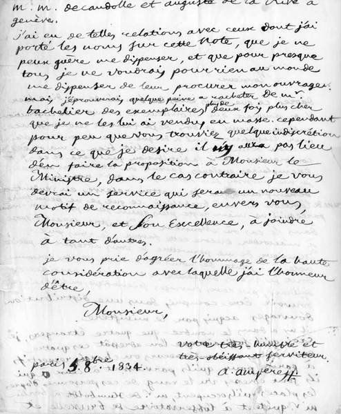 Monsieur / il se pourrait que Monsieur le Ministre de l'instruction publique auquel je dois déja tant de reconnaissance pour l'acquisition qu'il a daigné faire de cent exemplaires de mon dernier ouvrage, voulut bien, à ma prière, comprendre dans la distribution qu'il fera de ces exemplaires quelques savants ou littérateurs auxquels je me proposais d'en offrir sur le petit nombre d'exemplaires que je m'étais rservé en vendant le reste de l'édition à M. Bachelier, ce que je ne peux faire parcerqu'il ne m'en reste plus qu'un seul pour moi-meme. / Dans le cas ou M. le Ministre serait disposé a m'accorder encore cette faveur, je vous prie, Monsieur, de me permettre de vous adresser la petite note ci-jointe des noms et des adresses des personnes dont je viens de parler, et qui me paraissent d'ailleurs, par leur ouvrages scientifiques ou littéraires, pouvoir etre compris dans une distribution d'ouvrages acquis par le ministère. /Il n'y a dans le nombre que 4 étrangers, je crois qu'il suffirait que l'on adressat ces 4 exemplaires aux ambassadeurs.. à Paris pour qu'ils parvinssent à ceux qui sont adressés, vu le rang de ces personnes: Mr. de Humboldt à Berlin, Mr. Quételet à l'Observatoire de Bruxelles et M. de Candolle et Auguste de la Rive à Genève. / J'ai eu de telles relations avec ceux dont j'ai les noms dans cette note, que je ne peux guère me dispenser de leur procurer mon ourage. Mais j'éprouverais quelque peine a racheter de M. Bachelier des exemplaires plus de deux fois plus chers que je ne les lui ai vendus en masse..... / Je vous prie d'agréer...Monsieur, votre très humble.. serviteur.Con picc. mancanze (non di testo) ma complessivam. un buon esemplare.L'opera della quale Ampère parla è Littérature et voyages, Paris, 1834, in 2 volumi. Quest'opera era già apparsa in articoli nella Revue des deux Mondes.