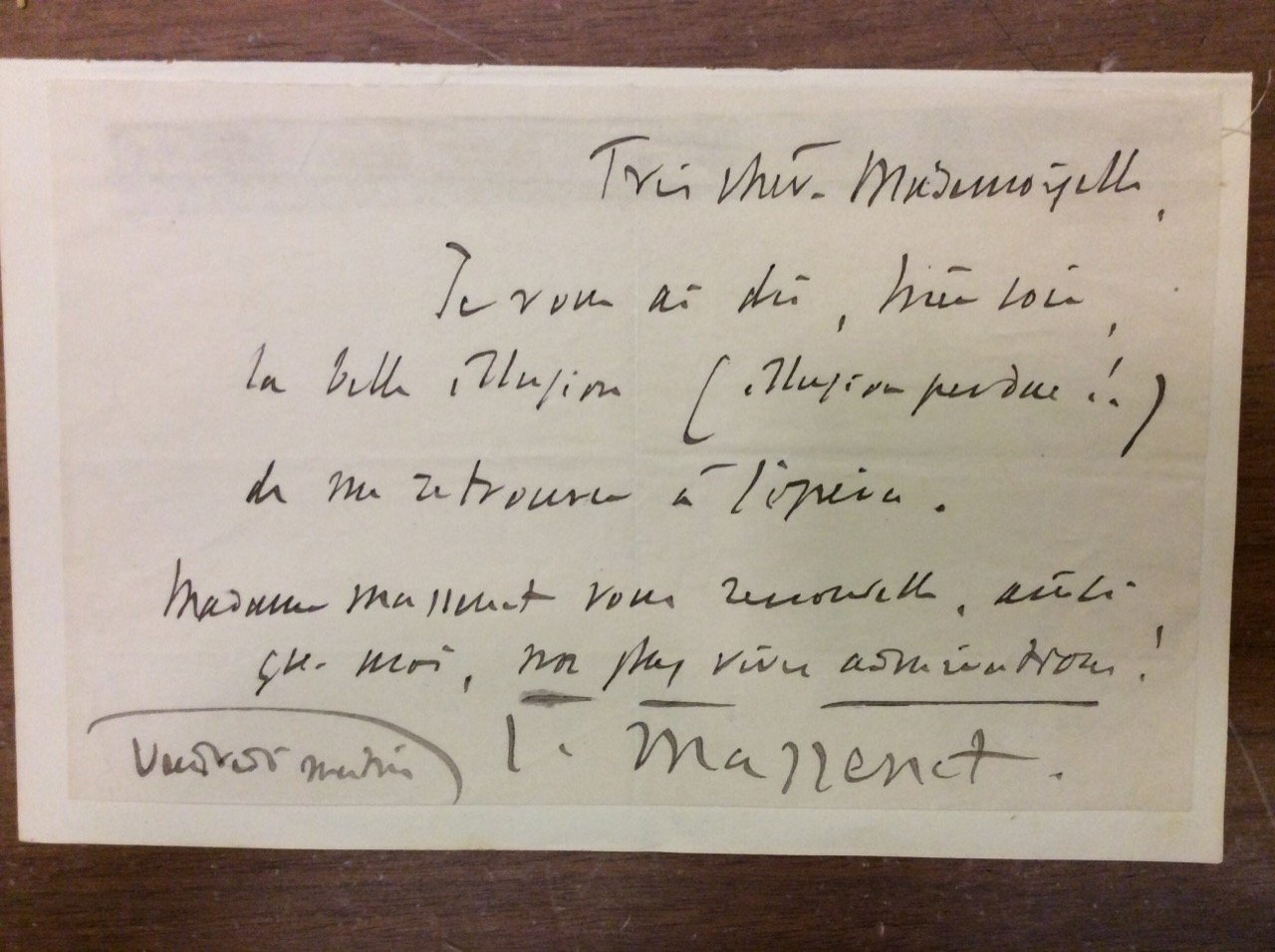 1 p. (mm. 113x180), s.d., di 7 righe.Trés chére Mademoiselle, / je vous ai dit hier soir la belle illusion (illusion perdue !!) de me retrouver à l'opera. / Madame Massenet vous renouvelle, ainsi que moi, nos plus vives admirations! / J. Massenet. Questa lettera - del più fortunato operista francese del suo tempo - è applicata su cartoncino ed è ben conservata.