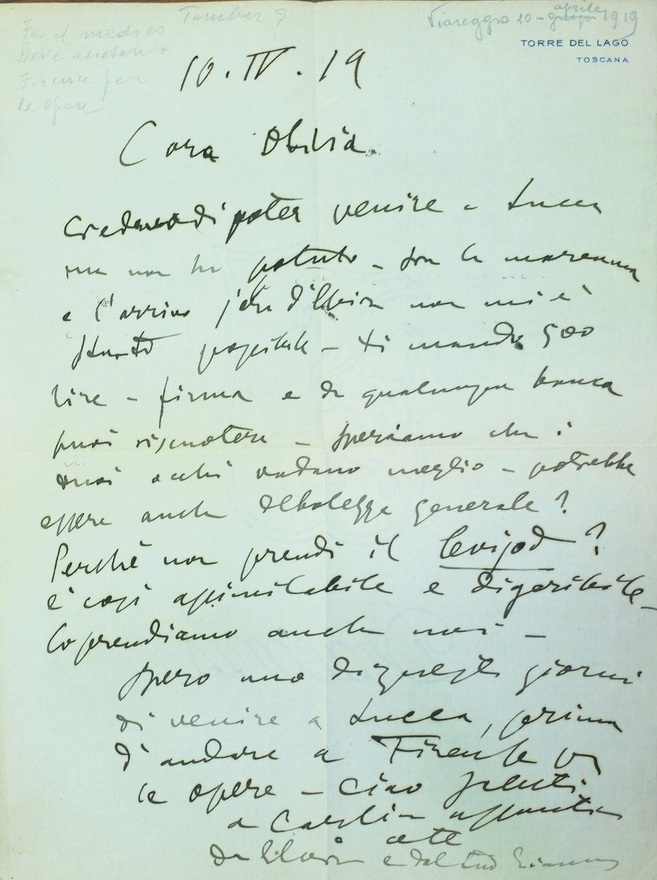 1 p. (mm. 275x206), datata 10.IV.19, su carta intestata Torre del Lago (Toscana), diretta alla sorella Otilia Del Carlo (Piazza Crocifisso, Lucca, come da busta affrancata, allegata), di 19 righe.Cara Otilia, / Credevo di poter venire a Lucca ma non ho potuto .. e l'arrivo ieri d'Elvira non mi è stato possibile - ti mando 500 lire - firma e su qualunque banca puoi riscuotere - speriamo che i tuoi occhi vedano meglio - potrebbe essere anche debolezza generale? Perchè non prendi il levijod? è così assimilabile e digeribile - lo prendiamo anche noi - Spero uno di questi giorni di venire a Lucca, prima di andare a Firenze per le opere - ciao saluti a Carlino .. e a te / da Elvira e dal tuo Giacomo.Otilia Del Carlo, sorella di Puccini, aveva sposato nel 1872 Massimo Del Carlo, medico oculista e più tardi sindaco di Lucca.Esemplare ben conservato. .