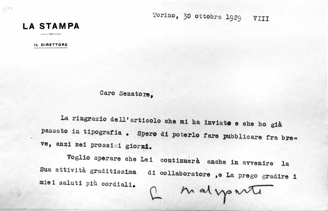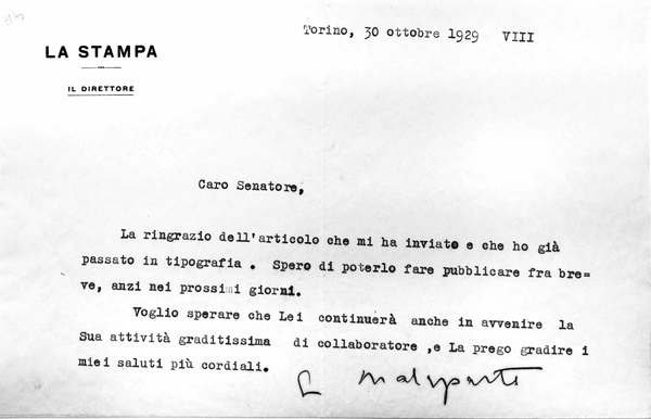 1 p. (mm. 276x213), datata: Torino, 30 ottobre 1929 VIII (su carta intestata de "La Stampa" di cui era Direttore), indirizzata al Prof. Baccelli, Roma, di 7 righe:"Caro Senatore, / La ringrazio dell'articolo che mi ha inviato e che ho già passato in tipografia. Spero di poterlo fare pubblicare fra breve, anzi nei prossimi giorni. / Voglio sperare che Lei continuerà anche in avvenire la Sua attività graditissima di collaboratore, e La prego gradire i miei saluti più cordiali. / C. Malaparte".Solo strappetti a un bordo esterno, altrimenti ben conservata.