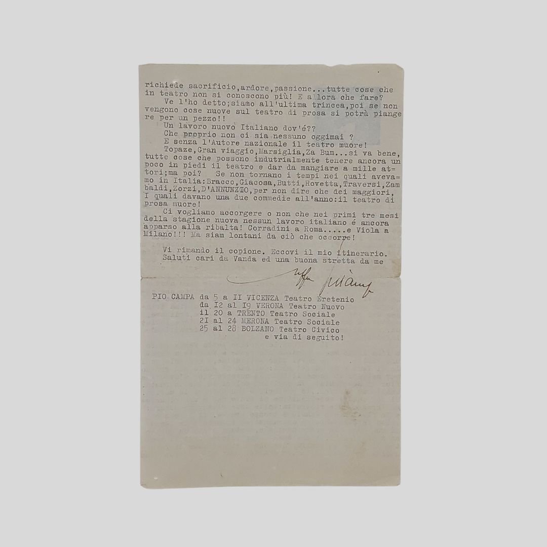 Pregevole e rara carta intestata (mm 140×227) color canna da zucchero, con ritratto di Wanda Capodaglio in versione mascherata e intestazione a due colori (rosso e blu) “Compagnia Italiana di Prosa Vanda Capodaglio diretta dal Gr. Uff. Uberto Palmarini. Rappresentate Comm. Pio Campa”. Dattiloscritto, senz a margini, a inchiostro nero al recto-verso con firma autografa. La missiva contiene alcune riflessioni personali sul figlio Roberto e su una riduzione de Il burrone di Ivan Aleksandrovic Goncarov, per la quale cita il fratello Odoardo e soprattutto interessanti e non scontate considerazioni sullo stato di crisi del Teatro italiano e la mancanza di opere teatrali italiane. Con accenni a opere e autori. Insignificanti tracce d”uso agli angoli. «[…] Il tempo ci vola di giorno in giorno in questo succedersi di debutti…ultima trincea del povero attore d’Italia! E preparare, ordinare, mettere a posto tutto, richiede un’organizzazione logistica…quasi come quella di un esercito in guerra! Ed infatti per noi è guerra tutti i giorni […] Ve l’ho detto; siamo all’ultima trincea, poi se non vengono cose nuove sul teatro di prosa si potrà piangere per un pezzo! Un lavoro nuovo Italiano dov’è? Che proprio non ci sia nessuno oggimai? E senza l’Autore nazionale il teatro muore! Topaze, Gran viaggio, Marsiglia, Za Bum…si va bene, tutte cose che possono industrialmente tenere ancora un poco in piedi il teatro e dar da mangiare a mille attori; ma poi? Se non tornano i tempo nei quali avevamo in Italia: Bracco, Giacosa, Butti, Rovetta, Traversi, Zambaldi, Zorzi, D’ANNUNZIO, per non dire che dei maggiori, i quali davano una due commedie all’anno: il teatro di prosa muore! Ci vogliamo accorgere o non che nei primi tre mesi della stagione nuova nessun lavoro italiano è ancora apparso alla ribalta! […] Vi rimando il copione. Eccovi il mio itinerario. Saluti cara da Vanda ed una buona stretta da me». <BR>Segue la tournée della Compagnia: «da 5 a 11 [novembre] Vicenza, Teatro Eretenio; da 12 al 19 Verona, Teatro Nuovo; il 20 a Trento, Teatro Sociale; 21 al 24 Merona, Teatro Sociale; 25 al 28 Bolzano, Teatro Civico e via di seguito!».