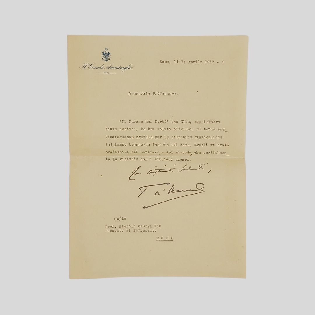 Dattiloscritto a inchiostro nero. Firma a inchiostro marrone, sulla rara carta intestata «Il Grande Ammiraglio». Dimensioni: mm 260×190. Pieghe di archiviazione, ma in buone condizioni di conservazione. Non comune. Lettera di ringraziamento per aver ricevuto in omaggio dal Castellino il suo ultimo libro “Il lavoro nei Porti”: «[…] mi torna particolarmente gradito per la simpatica rievocazione del tempo trascorso insieme sul mare […]». Paolo Thaon di Revel, all’anagrafe Paolo Camillo Margherita Giuseppe Maria [Torino 1859-Roma 1948). Ammiraglio e politico italiano, nel 1924 fu insignito del titolo di (primo) Duca del Mare e successivamente promosso Grande Ammiraglio, l’unico nella storia della Marina italiana, rimanendo in tal modo in servizio a vita con un proprio ufficio al ministero. Fu presidente della Società geografica italiana dal 1921 al 1923. All’avvento del fascismo, assunse la carica di ministro della Marina, che mantenne fino al 1925. Sostenne il potenziamento dell’aviazione navale, l’impiego dei treni armati, la creazione dei moderni fanti di marina e dei MAS. Nicolò Castellino, [Genova 1893-Roma 1953]. Si trasferì con la famiglia a Napoli, ove il padre era stato chiamato a dirigere la cattedra di clinica medica. Iscrittosi alla facoltà di medicina e chirurgia dell’università di Napoli nel 1910, fu allievo di A. Cardarelli. Scoppiata la prima guerra mondiale si arruolò volontario. Tornato a Napoli conseguì la docenza in patologia medica e in medicina del lavoro. Svolse anche un ruolo di primo piano nella lotta politica napoletana, fu nominato segretario della federazione del PNF di Napoli e fu Deputato per due legislature. Nel 1931 pubblicò Il lavoro nei porti, Milano A. Cordani, pref. di G. Ciano. Alla metà degli anni Trenta il C. alternò l’attività di deputato e di scienziato con quella di uomo d’affari, amministratore di società operanti in settori diversi e molteplici, che andavano dall’editoria (Giornale d’Italia, Nuova Antologia, Casa editrice Demetria), al traffico immobiliare (Società italiana per imprese fondiarie), al ramo assicurativo (Riunione adriatica di sicurtà) e agli stabilimenti termali (Terme di Agnano). Gli incarichi ricoperti in queste aziende gli consentirono, nel 1934, di entrare nella giunta esecutiva centrale della Confederazione generale fascista dell’industria italiana, quindi di assumere la presidenza della Federazione nazionale fascista editori di giornali ed agenzie di stampa (28 sett. 1934), infine di essere nominato membro della Corporazione della carta e della stampa in rappresentanza delle industrie editoriali giornalistiche (8 nov. 1934), e nel 1935 componente del consiglio ’direttivo dell’Ente nazionale per la cellulosa.