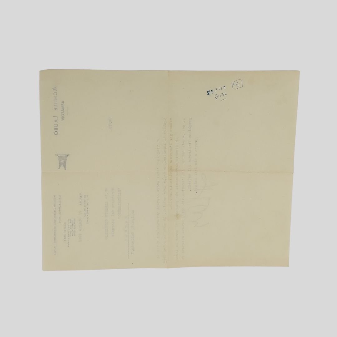 Carta intestata con filigrana (mm 228×287) “Achille Lauro Armatore”. Al verso annotazione a biro, numero telefonico e orario. In perfetto stato, con naturali pieghe di archiviazione. L’editore chiede al direttore Alberto Consiglio notizie circa «La pratica di importazione delle note matrici [tipografiche]». Achille Lauro, durante il regime fascista, deteneva – in quota con il Banco di Napoli – la Società Editrice Meridionale, proprietaria delle testate Il Mattino, Roma e Corriere di Napoli. All’indomani della sollevazione popolare contro i Nazifascisti, il P.W.B (Organo di controllo per i media del Comando Alleato) – su suggerimento di Benedetto Croce – decide di sospendere temporaneamente le tre testate napoletane ancora influenzate dal fascismo, per sostituirli con un unico quotidiano indipendente e antifascista “Il Risorgimento”. Tutto ciò è tanto più necessario in quanto i giornali esistenti erano stati interamente ricostruiti ai suoi fini dal fascismo che li fece acquistare in parte dal Banco di Napoli e per l’altra parte da un noto armatore [Achille Lauro, n.d.c.] strettamente legato di interessi e di opere col regime fascista, e in particolare con la banda Ciano. Nel periodo di relativa libertà che corse dalla caduta del fascismo (25 luglio) all’armistizio (8 settembre), di questo predominio degli interessi di un singolo personaggio ed industriale si videro gli effetti nella condotta di quei giornali, e specialmente del Mattino, che espresse tendenze contraddittorie e mise ai primi posti, con scandalo della pubblica opinione, tra gli articolisti qualche screditato personaggio politico che, dopo aver fatto l’antifascista, si era conciliato col fascismo e lo aveva servito» [cfr. Benedetto Croce, Lettera autografa indirizzata al al Ten. Col. John T. Whitaker]. Su indicazione dello stesso Croce, Floriano del Secolo fu nominato direttore de Il Risorgimento (1944) – primo quotidiano di Napoli liberata. Nel giugno 1946, quando la gestione della S.E.M. ritornò ad Achille Lauro, Del Secolo si dimise dalla direzione del giornale, fu sostituito prima da Corrado Alvaro [marzo-luglio 1947] e successivamente da Alberto Consiglio [1947-48]. Il giornale terminò le pubblicazioni nel 1950.