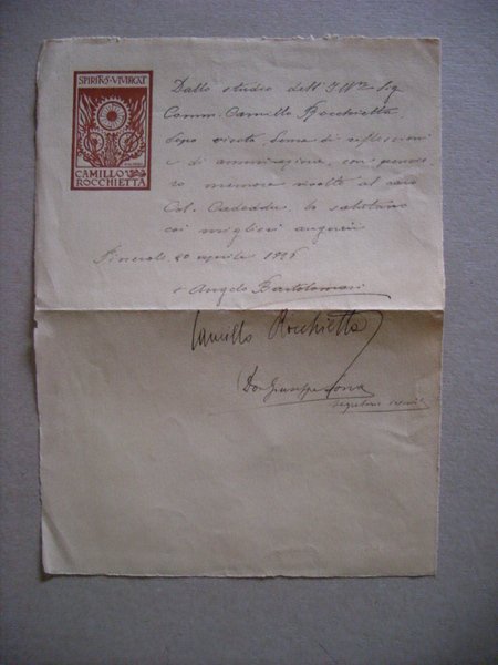 Lettera manoscritta e firmata ANGELO BARTOLOMASI. Presente anche la firma di CAMILLO ROCCHIETTA. Anni´30