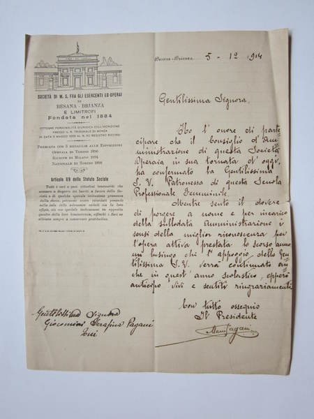 Lettera manoscritta e firmata Presidente Mario Pagani. Carta intestata Società di M.S. fra gli Esercenti ed Operai 1914