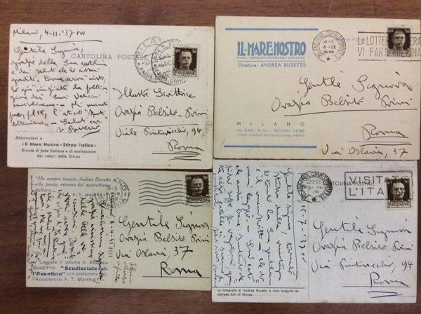Offriamo un lotto composto da 4 cartoline, tutte inviate e autografate da Andrea Busetto nazionalista, costantemente vicino al futurismo politico, dagli anni dieci sino alla fine del fascismo, si avvale della prefazione di Marinetti ne "Gli italiani dell'altra sponda" (Venezia, L'avanguardia Nazionalista, 1915). Scrittore-editore, Busetto pubblicherà dopo molti anni un secondo volume introdotto da Marinetti, "Scudisciate all'Aventino" (1929) (così Salaris, Storia del futurismo, p. 80).Ben conservate.