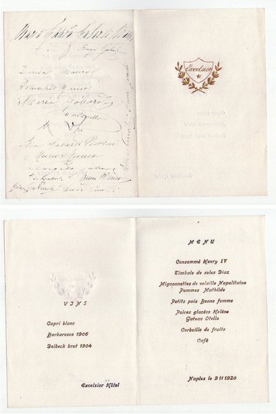 Menù Albergo EXCELSIOR - Napoli 1920 "Vini" con numerose firme tra cui Maria e Biagio Gabardi