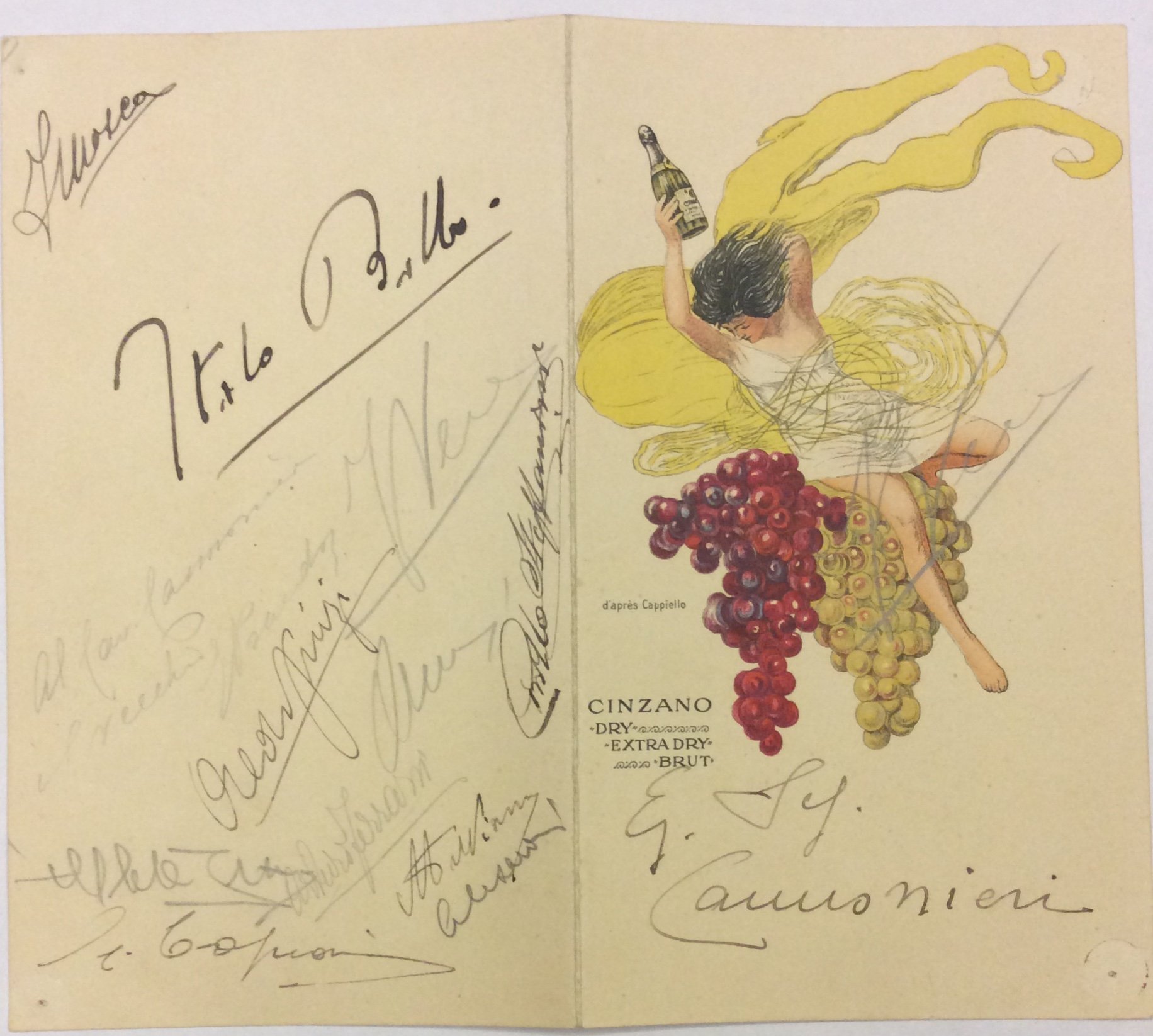 Cartoncino (mm. 166x95) con la riproduzione a colori di uno dei più celebri e rappresentativi manifesti pubblicitari della Cinzano - Donna adagiata sui grappoli d'uva - eseguito da Cappiello. Vi è contenuto il seguente menu: Tortellini alla Genovese // Bordura di spinaci alla finanziera // Noce di vitella di Monza tartufata // Insalata mista all'italiana // Fragole di Nemi al marsala // Caffè - Vini: Frascati secco // Chianti vecchio // Gran Cinzano Dry. Esemplare di estrema rarità dovuta alle firme di importanti personaggi italiani dell'epoca, tra cui: Italo Balbo, Arturo Ferrarin e l'Ing. Caproni. Leonetto Cappiello (Livorno 1875 - Cannes 1942), pittore, illustratore e caricaturista, padre del manifesto moderno, trasferitosi a Parigi nel 1897 dove svolse l'attività di decoratore, illustratore e caricaturista su Le Rire, L'Assiette au Beurre, Fantasio. (Cfr. Pallottino, p. 220).Ben conservato.