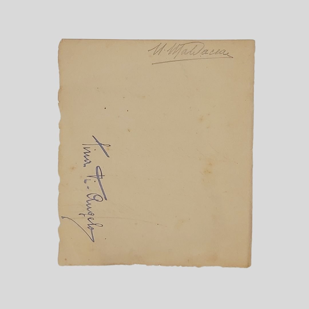 Sono presenti, inoltre al recto-verso della pagina le seguenti Firme autografe: 1. Cecilia Gagliardi, soprano [Roma 1881 – ?] : «Napoli 1914», manoscritto a inchiostro marrone. 2. Nicola Maldacea, comico del varietà italiano [Napoli 1870 – Roma 1945]: Firma manoscritta a lapis. 3. Tina Di Angelo, mezzosoprano attiva fino ai primi anni ’20 del ‘900: firma autografa a inchiostro blu. Lieve brunitura. In buone condizioni.