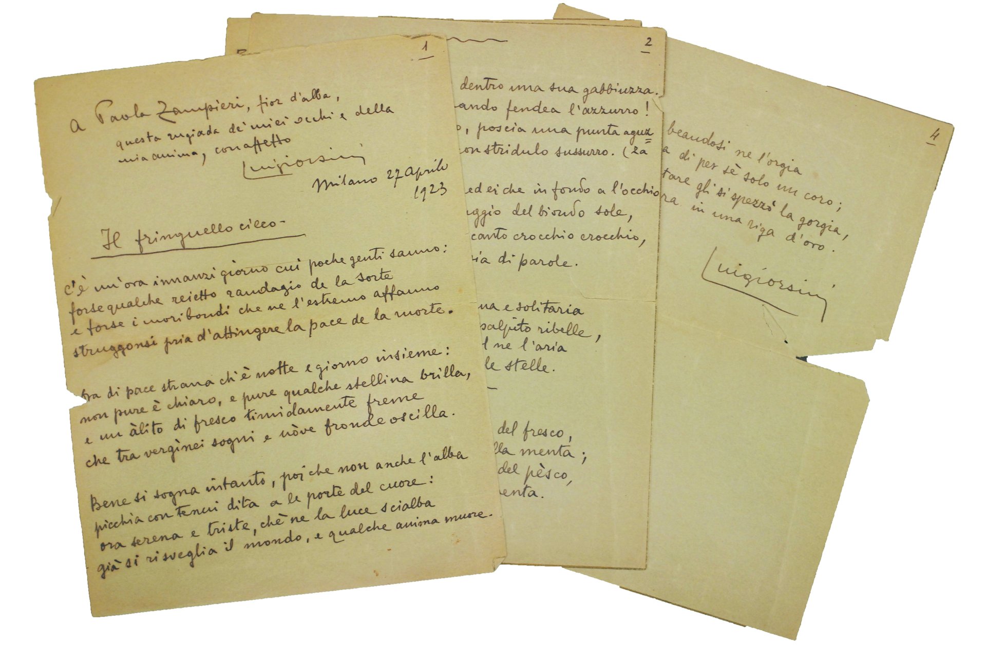 4 pp. (mm. 224x172), dedica a Paola Zampieri, fior d'alba, questa rugiada de' miei occhi e della mia anima, con affetto, in data Milano 27 aprile 1923. Ispirata poesia intitolata Il fringuello cieco, di 48 versi; unito un frammento di busta indirizzata Alla cara giovinetta Paola Zampieri. Sue gentili mani (figlia del musicologo Giusto Zampieri, insegnante al Conservatorio di Milano).C'è un'ora innanzi giorno cui poche genti sanno: / forse qualche reietto randagio de la sorte e forse i moribondi che ne l'estremo affanno / struggonsi pria d'attingere la pace de la morte.Ora di pace strana ch'è notte e giorno insieme: / non pure è chiaro, e pure qualche stellina brilla, e un àlito di fresco timidamente freme / che tra vergìnei sogni e nòve fronde oscilla.Bene si sogna intanto, poi che non anche l'alba / picchia con teneri dita a le porte del cuore: / ora serena e triste, chè ne la luce scialba / già si risveglia il mondo, e qualche anima muore.C'era un fringuello cieco dentro una sua gabbiuzza. / Oh come gaio un tempo, quando fendea l'azzurro! / Diè ne la ragna un giorno, poscia una punta aguzza / li arse l'umor de liocchi con stridulo sussurro.Canta! gl'impose l'uomo: ed ei che in fondo a l'occhio / avea fermato un ultimo raggio del biondo sole, / al canta! singhiozzava un canto crocchio crocchio, / come se dentro avesse un'ansia di parole.E ogni notte in quell'ora sì strana e solitaria / sentiva in sè l'angoscia d'un palpito ribelle, / sì che avrebbe voluto togliersi a vol ne l'aria / e riposarsi alfine sui lembi di stelle.--------E una volta più vivo sentì l'odor del fresco, / sentì l'olezzo forse del timo e della menta; / rivide dal suo buio il roseo fior del pèsco, / ebbe la primavera ne la pupilla spenta.E un desiderio immenso di campagna e di sole, / di volare nel sole, di posar fra l'ajòle, / di perdersi tra effluvi di fieni e di viole, / di liberar canzoni che sembrasser parole,/tale un barbaglio mise ne la pupilla cieca, / diede a l'alucce stanche tanta virtù che, rotte / le sbarre in breve a furia de la sua furia bieca, / volò ne l'ora strana che non è dì nè notte.--------------Ed ecco che volando iva lontan lontano, / dove il ciel si tingeva di fieni e di viole, / e già verso oriente, fuor del palagio arcano / fra luci e perle e sprazzi riscintillava il sole./Dentro una riga d'oro il povero fringuello / si mise: e non vedeva; ma lo sentiva nel core, / nel piccioletto core, che ciò era pur bello, / ch'era il suo sole, quello, de le passate aurore!E trillò così forte, beandosi ne l'orgia / de' raggi, che parea di per sè solo un coro; / ma pe'l troppo cantare gli si spezzò la gorgia, / e cadde morto in terra in una riga d'oro. Luigi Orsini"Luigi Orsini, intellettuale poliedrico, poeta, romanziere, librettista. Tenne la cattedra di letteratura poetica e drammatica nel Regio Conservatorio di Milano, dal 1911 al 1938". Picc. strappi marginali sulla piegatura dei fogli e picc. manc. sulla prima pag. con relativa perdita di testo, altrimenti esemplare ben conservato.