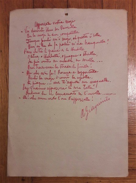 Poesia manoscritta e firmata da Adolfo Giaquinto.