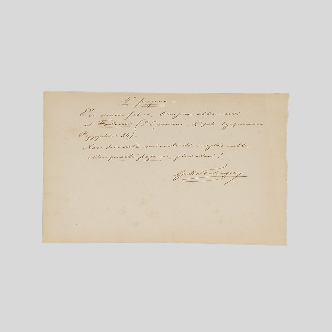 frammento di pagina (mm 138×220) di “liber amicorum” manoscritto a inchiostro nero, cinque righi di testo oltre il titolo e la firma. Non datato, ma fine ‘800. Il direttore del «Fortunio» promuove il suo giornale con un’antesignana forma di marketing pubblicitario.<BR>«4a pagina. Per viver felici, bisogna abbonarsi al Fortunio (L. 6 annue. Napoli Egiziaca a Pizzoflacone 24). Non trovate niente di meglio nelle altre quarte pagine, giurateci!…»<BR>«Tra i vari fogli apparsi nell’ultimo scorcio dell’Ottocento, quello che ebbe vita più lunga fu il “Fortunio” (sottotitolato “Cronaca illustrata della domenica”), fondato dal letterato e giornalista Giulio Massimo Scalinger, il quale si formò con Federigo Verdinois presso il “Corriere del Mattino”. Modernamente concepito e architettato, il periodico riscosse un grande successo in tutta Italia dove «i giornali letterari vantano solo una statistica di iettatura!». Diverse furono le strategie usate per attrarre i lettori: corrispondenze dalle principali città italiane ed europee come Parigi, Londra, Berlino, Vienna; gli articoli culturali ebbero un taglio giornalistico in modo da rendere meno noiosa la ricezione da parte del pubblico; grande attenzione fu data alla veste tipografica attraverso l’uso del formato “in folio”; e una ricca illustrazione spesso realizzata dai principali pittori dell’epoca come Eduardo Dalbono e Domenico Morelli. Il giornale si pose l’obiettivo di diffondere al Nord la cultura meridionale in modo da mutare una situazione, creatasi in seguito all’Unità, che vedeva la presenza di una forte e moderna editoria settentrionale. Questo spiega la presenza di molti collaboratori provenienti dalle varie province del Mezzogiorno i quali, attraverso un’opera di rivisitazione e rivalutazione, vollero dare il giusto rilievo alla propria cultura. […] Forte della popolarità raggiunta, il periodico affiancò alla sua regolare attività quella di editore di libri, infatti attraverso la rubrica «Schegge» veniva annunciata l’uscita di una serie di opere che andavano a costituire la cosiddetta Collezione Fortunio». [cfr. Alessia Romana Zorzenon, Roberto Bracco giornalista]. Negli ultimi anni di vita la rivista iniziò a concedere ampi spazi alla canzone napoletana anche attraverso inserti musicali, dedicando alcuni numeri alla Piedigrotta. Nel 1897 uscì un numero monografico “Fortunio-Piedigrotta”. Nel 1899, anno in cui fu costretta a chiudere per motivi economici» [Cfr. Enrico Careri e Giorgio Ruberti, Studiare la Canzone napoletana, Lucca, Lim, 2015]. Giulio Massimo Scalinger [Napoli 30 ottobre 1857 – Napoli 26 agosto 1907]. Figlio del pittore Nicola Scalinger, studiò all’Università di Napoli, dove fu allievo del filosofo e professore di estetica Antonio Tari ma si laureò in giurisprudenza.Critico teatrale e musicale, collaborò con vari giornali e riviste. Nel 1893 pubblicò due commedie e due anni dopo un suo dramma lirico, Fortunio, con musica di Niccolò van Westerhout, venne rappresentato al Lirico di Milano. Nel 1888 fondò a Napoli il «Fortunio», settimanale illustrato della domenica, che riscosse notevoli apprezzamenti e poté contare su contributi di parecchi letterati di successo. Oltre alla direzione della rivista, per circa dieci anni, e alle collaborazioni giornalistiche, pubblicò alcuni studi di estetica e articoli di critica teatrale e musicale. Entrò nelle biblioteche governative nel 1898, come sottobibliotecario destinato alla Biblioteca Lucchesi Palli di Napoli.Resse la direzione della Biblioteca Lucchesi Palli ad interim dal trasferimento di Achille Torelli (ottobre 1900) alla nomina di Salvatore Di Giacomo (1º settembre 1902), venendo quindi trasferito dal 1º giugno 1903 alla Biblioteca nazionale di Napoli, dove si concluse la sua breve carriera. Negli ultimi anni aveva lavorato anche all’archivio del Banco di Napoli.