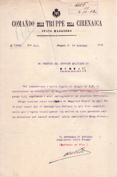 Note: comunicazione firmata del Generale Raffaele de Vita datata 1 ottobre 1920 su carta intestata "Comando delle Truppe della Cirenaica"; discreto es.