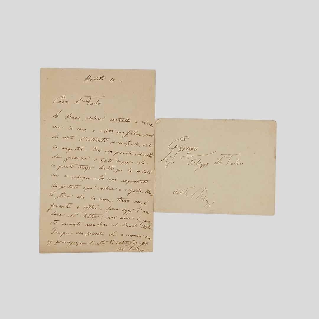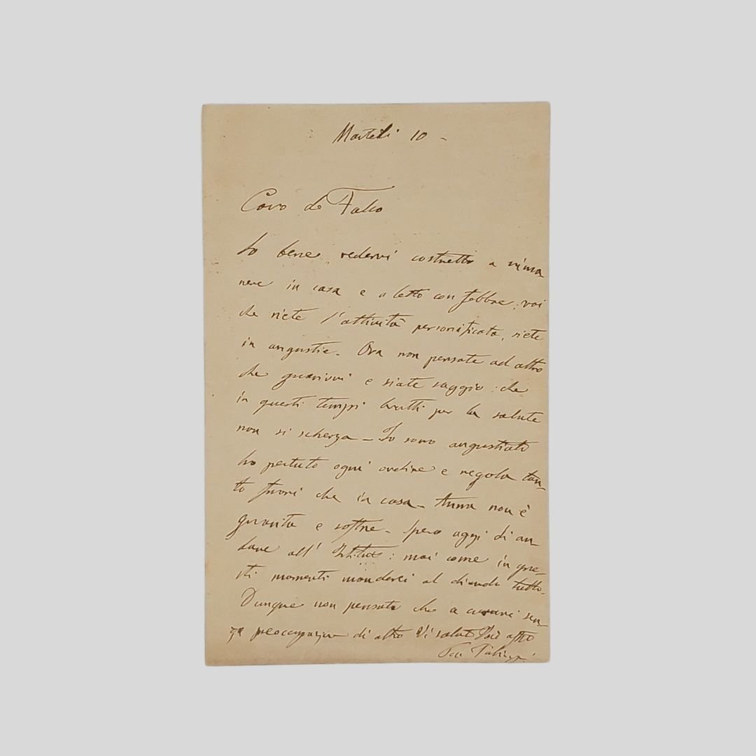 È presente la busta. Bifolio (scritta una pagina), mm 180×112, manoscritto con inchiostro marrone, 14 righi oltre la firma. Lettera personale con riferimento all’Istituto di belle arti, non datata (dopo il 1890). «So bene vedervi costretto a rimanere in casa e a letto con febbre, voi che siete l’attività personificata, siete in angustie. Ora non pensate ad altro che a guarirvi e siate saggio: che di questi tempi brutti per la salute non si scherza. Io sono angustiato ho pertuto [sic!] ogni ordine e regola tanto fuori che in casa. Anna non è guarita e soffre. Spero oggi di andare all’Istituto: mai come in questi momenti manderei al diavolo tutto. […]». Filippo Palizzi (Vasto 1818 – Napoli 1899) Pittore italiano, nativo dell’Abruzzo, ma di formazione napoletana. Fu uno dei maggiori artisti italiani della seconda metà del XIX secolo e uno degli esponenti più originali del verismo in pittura. Entrò nel corpo docente del Real Istituto di belle arti di Napoli nel 1868, anno in cui collaborò con Domenico Morelli a una riforma dell’insegnamento accademico che vide la luce solo nel 1878. In quell’anno venne nominato direttore generale delle scuole della Società operaia napoletana e, poco dopo, per volere del ministro Francesco De Sanctis, presidente del Real Istituto di belle arti di Napoli. Ma, quando si crearono delle divergenze sulla nomina del docente di scultura, nel 1881 decise di dare le dimissioni, seguito a ruota da Morelli. Con decreto del 1° marzo 1891 ottenne nuovamente la nomina di presidente del Real Istituto di belle arti di Napoli, e poco dopo quella per l’insegnamento di pittura di paese e animali. Con i concetti di «finezze» e «totalità» Palizzi definiva la sua poetica che si basava su una personale concezione della «macchia», in quanto la «totalità» alludeva all’impressione d’insieme propria della «macchia», che però doveva essere completata dalle «finezze», ossia dalla resa delle sottigliezze percettive. I passaggi chiaroscurali in lui si fondavano su un’attenzione micrografica agli effetti di luce piuttosto che su una visione sintetica; e questo sarebbe stato oggetto di polemiche con un artista come Cammarano, ma avrebbe suscitato l’interesse di Vittorio Imbriani che, proprio analizzando la sua pittura, era pervenuto alla definizione teorica del concetto di «macchia» in una sua nota recensione alla quinta Promotrice [Cfr. V. Imbriani, La Quinta Promotrice 1867-1868 (1868); Doria, pp. 42 s.]. Filippo de Falco ( Napoli 1852 – Ivi 1926). Figlio del pittore Carlo, Filippo studia dal 1866 al 1870 all’Istituto di Belle Arti di Napoli. Esordisce nel 1873 alla Promotrice di Napoli con i dipinti Ritratto nello studio e Ricordo dei ponti rossi. Su proposta di Domenico Morelli e dello stesso Filippo Palizzi, nel 1891 viene nominato conservatore e ispettore dell’Istituto di Belle Arti di Napoli.