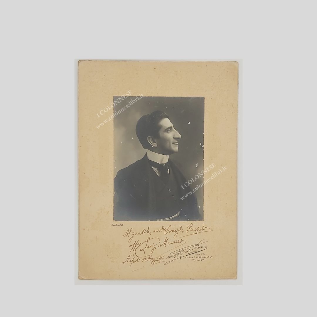 Ritratto fotografico con dedica e firma autografa. Invio al critico teatrale Consiglio Rispoli, ‘Napoli 23 maggio 1906’. «Al gentile avv. Consiglio Rispoli offre Luigi Merazzi».