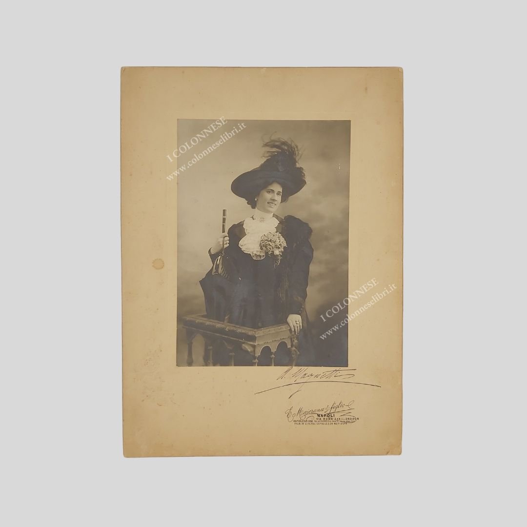 Rarissima fotografia ai sali d’argento, virata in seppia, montata su supporto in cartone, mm 227×158 (fotografia), mm 355×255 (supporto). Sul fronte è presente il marchio del fotografo: «E. Maiorana & figlio. Napoli Via Toledo (Palazzo Berio)».Tracce d’uso agli angoli. Intenso e sorridente ritratto fotografico della "Duse napoletana". Adelina Magnetti: l'Assunta Spina per antonomasia.