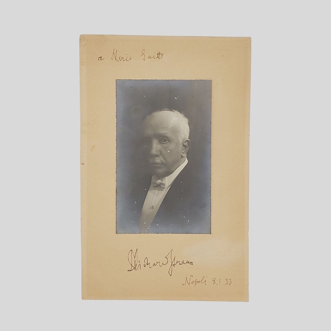 Dedica “a Mario Saitto” a inchiostro nero al margine superiore, data e firma al margine inferiore del cartoncino. Fotografia applicata su cartoncino avana. Dimensioni della fotografia: mm 87×141. Dimensioni del supporto: mm 152×240. La fotografia riporta tracce d’uso,un graffio all’altezza dell’occhio e una lieve incrinatura. Raro. S. tra l’altro tra il 1933 e il 1934 diresse l’Orchestra del Teatro San Carlo proponendo delle sue opere. L’autografo è dedicato a Mario Saitto contrabbassista dell’orchestra.
