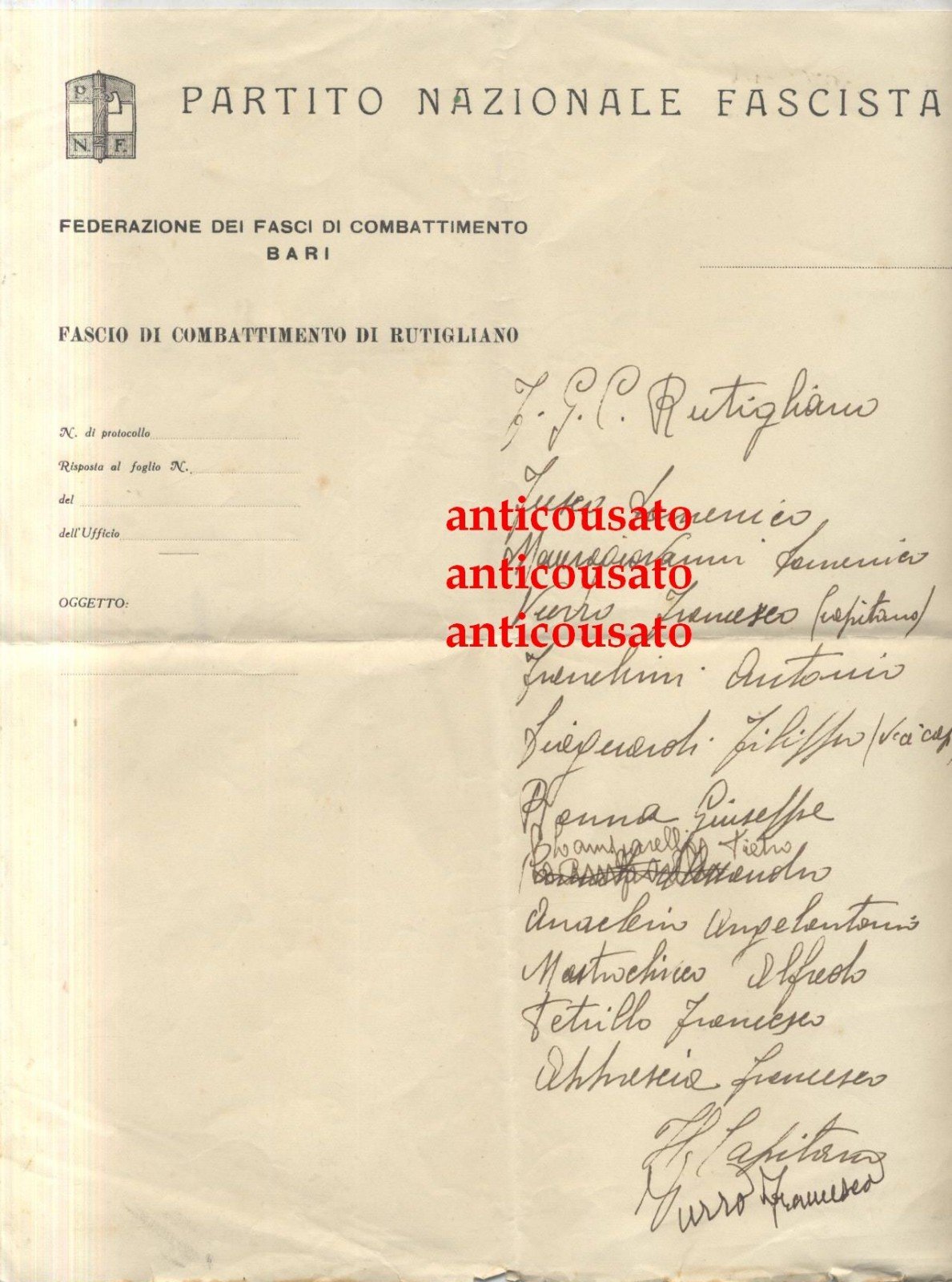 Interessantissima carta intestata della FGC Rutigliano su carta della federazione dei fasci di combattimento, senza data (ma 1933) con la formazione della squadra nella partita contro ??? con firma autografa del capitano Francesco Vurro.