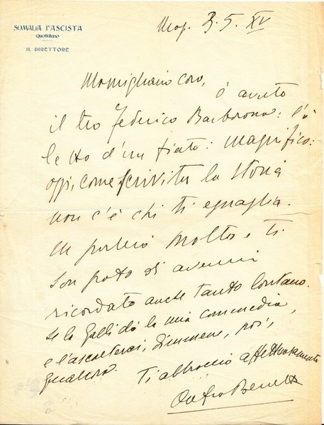 Note: lettera manoscritta e firmata di Alfio Berettta di 1 facciatata datata 3 Maggio 1937 su carta intestata "Somalia Fascista. Il Direttore"; lievi strappetto in corrispondenza della piegatura; discreto es.
