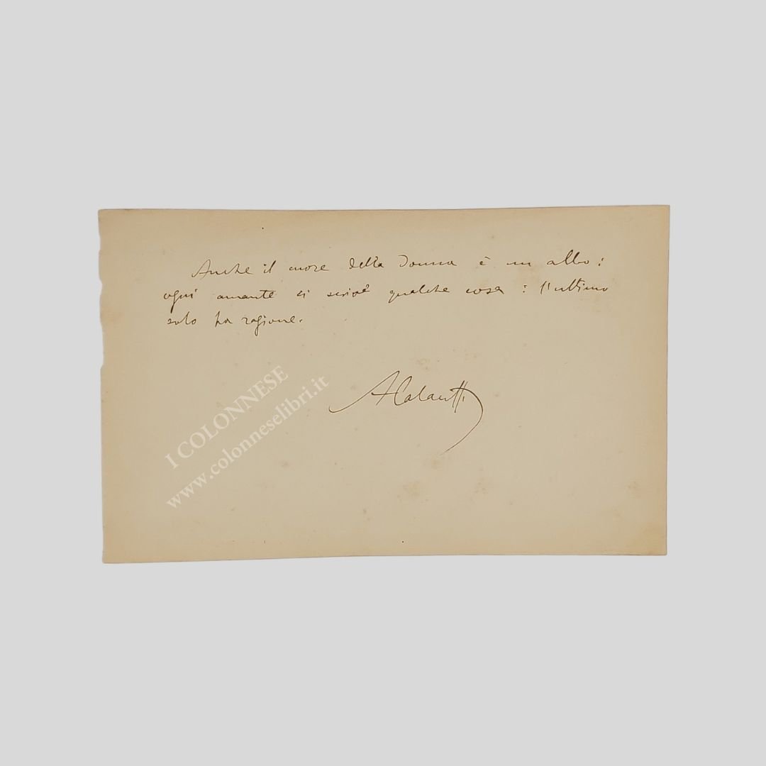 Pensiero estemporaneo su frammento di pagina (mm 222×138) di “liber amicorum”, manoscritto a inchiostro marrone. Tre righi oltre la firma. Raro. Arturo Colautti [Zara 1851 – Roma 1914]. Celebre giornalista, scrittore e librettista. Trascorse l’adolescenza nella città natale, dove si diplomò per poi svolgere il servizio di leva nell’esercito austro-ungarico.<BR>Colautti si interessò molto precocemente al giornalismo ed all’età di 17 anni fondò il giornale “Il Progresso” prima e “La Leva” poi. In quel periodo studiò alle Università di Vienna e Graz. Andò poi a Fiume a dirigere “La Bilancia”, per poi tornare nella nativa Zara a dirigere “Il Dalmata” dal 1872 al 1874. Passato a Spalato nel 1876, vi fondò la “Rivista Dalmatica di cultura e letteratura”, ma l’impresa non ebbe lunga vita. Nello stesso anno fu chiamato a dirigere “L’Avvenire”, al quale diede un’impronta nettamente irredentistica che gli causò le antipatie dei croati spalatini. In seguito all’apparizione di un articolo anti-austriaco apparso sul suo giornale, nel settembre 1880 Colautti subì un’aggressione da parte di un gruppo di soldati che lo rese infermo per qualche mese. Poco dopo, in seguito anche a minacce di querela per reati di stampa, Colautti scelse la via dell’esilio e si rifugiò nel Regno d’Italia. Fondato il “Corriere del Mattino” di Napoli (1885), Colautti ne divenne il direttore e vi rimase per quindici anni, quando passò alla direzione del “Corriere di Napoli”. Nel lungo periodo partenopeo scrisse centinaia di articoli, ma anche poesie, romanzi e opere teatrali con una discreta fama; alcuni suoi libretti operistici furono musicati (Adriana Lecouvreur, di Cilea, Fedora, di Giordano e Doña Flor, di van Westerhout). Amico di Giosuè Carducci, Alfredo Oriani e Gabriele D’Annunzio, fu scrittore aggressivo e polemista veemente. Provò intensa passione per Annie Vivanti, per la quale scrisse una composizione in sette sonetti dal titolo Annie, pubblicata sulla Cronaca Partenopea, e sostenne un duello con Matteo Renato Imbriani. Con lo pseudonimo di “Fram”, Colautti fu anche critico militare del Corriere della Sera nel corso della guerra russo-giapponese (1904). Per tutta la durata dell’esilio Colautti mantenne stretti contatti con gli irredentisti dalmati e partecipò attivamente a varie manifestazioni e congressi nazionalistici. Allo scoppio della prima guerra mondiale fu tra gli interventisti, ma morì alcuni mesi prima dell’intervento italiano nel conflitto. <BR>Per questioni di ordine pubblico non ebbe onoranze pubbliche; la sua salma fu tumulata nel corso di una cerimonia privata al cimitero del Verano.
