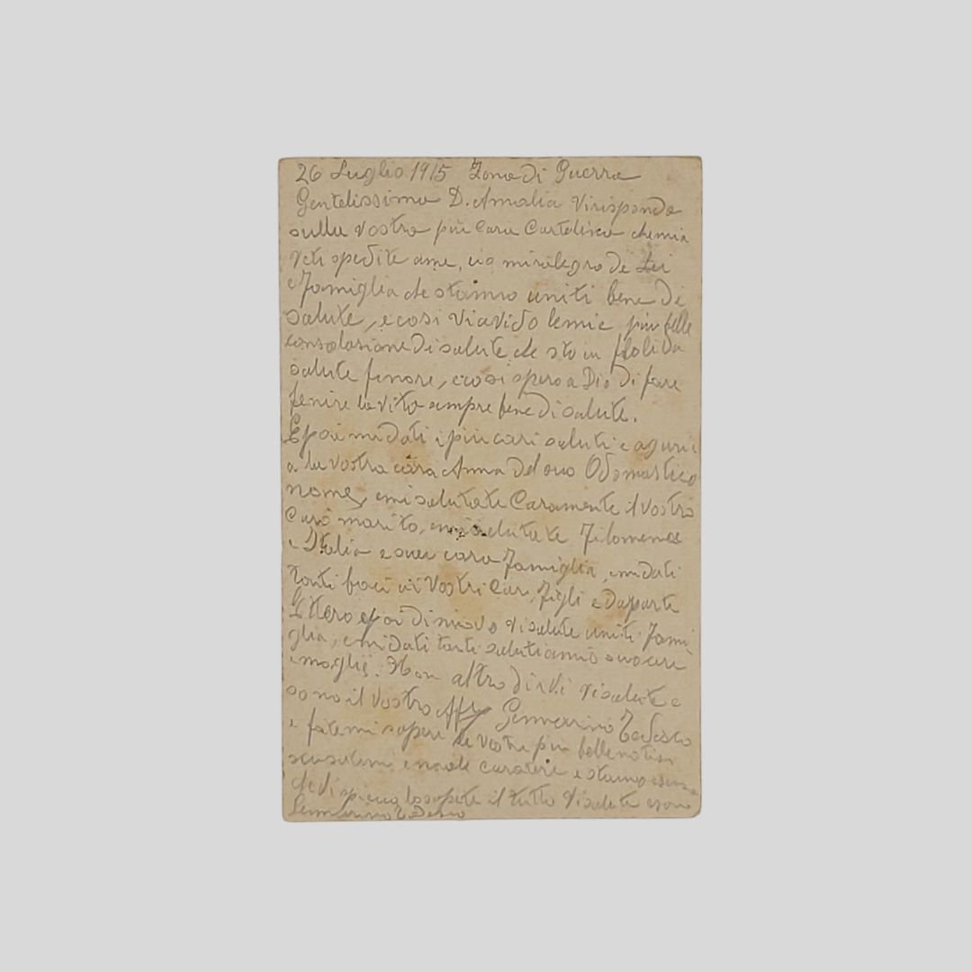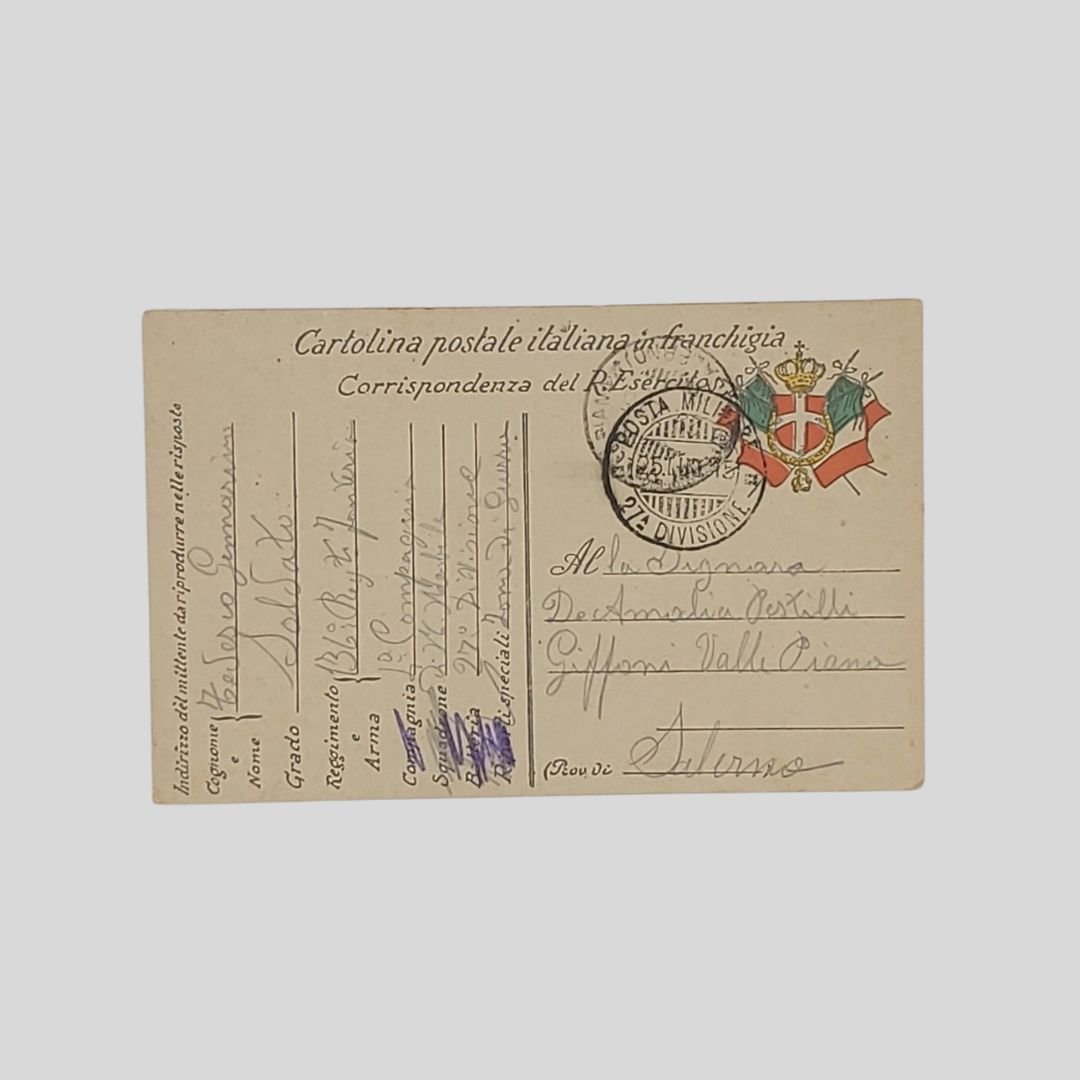 Cartolina in franchigia del R. Esercito. Viaggiata, cm 14×9. Timbro posta militare (26/07/1915). Inviata in provincia di Salerno. Tracce d’uso.