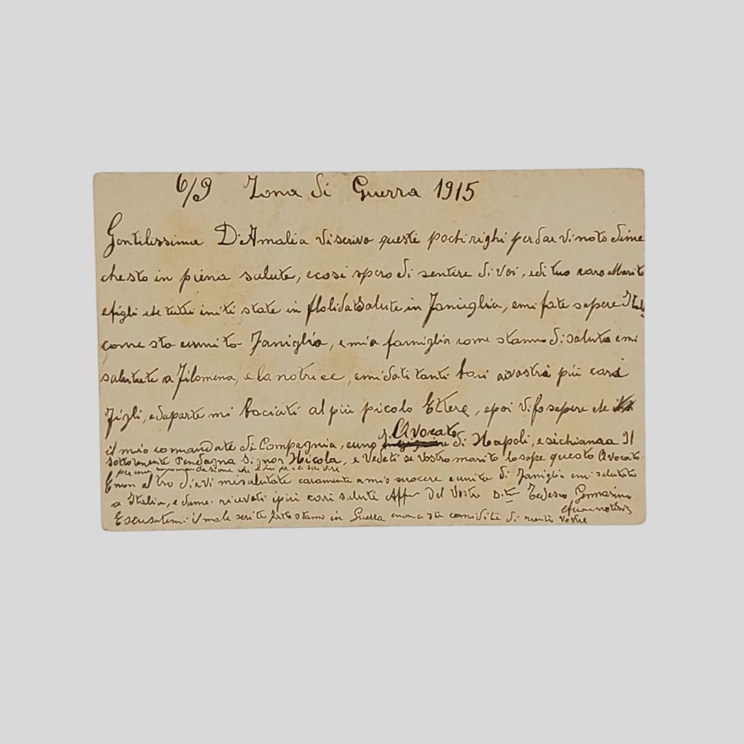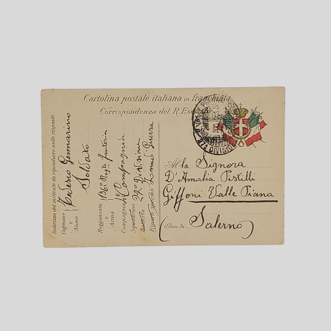 Cartolina in franchigia del R. Esercito. Viaggiata, cm 14×9. Timbro posta militare (6/09/1915). Inviata in provincia di Salerno. Tracce d’uso.