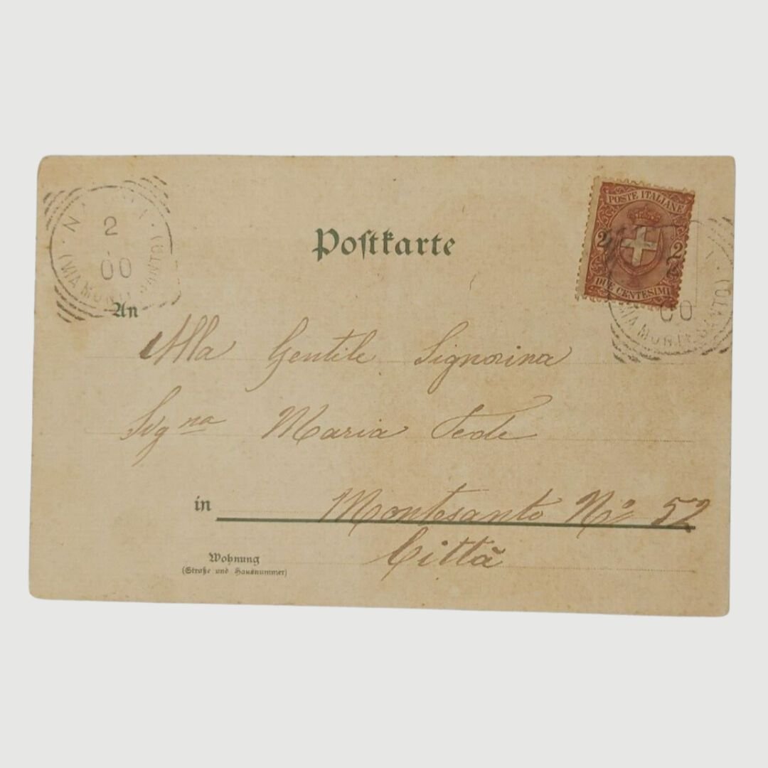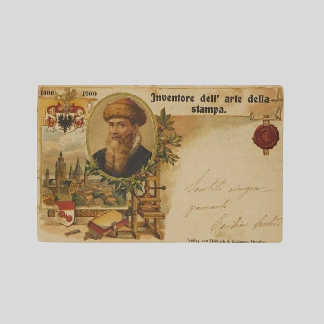 Undivided back. Cartolina cromolitografica. Viaggiata, francobollo, timbro postale, cm 14x9. Tracce d'uso. Nel cinquecentesimo anniversario della nascita di Johannes Gutenberg (Magonza, 1400 ca.- 1468) Orafo e tipografo tedesco inventore della stampa moderna in Europa. Non comune.