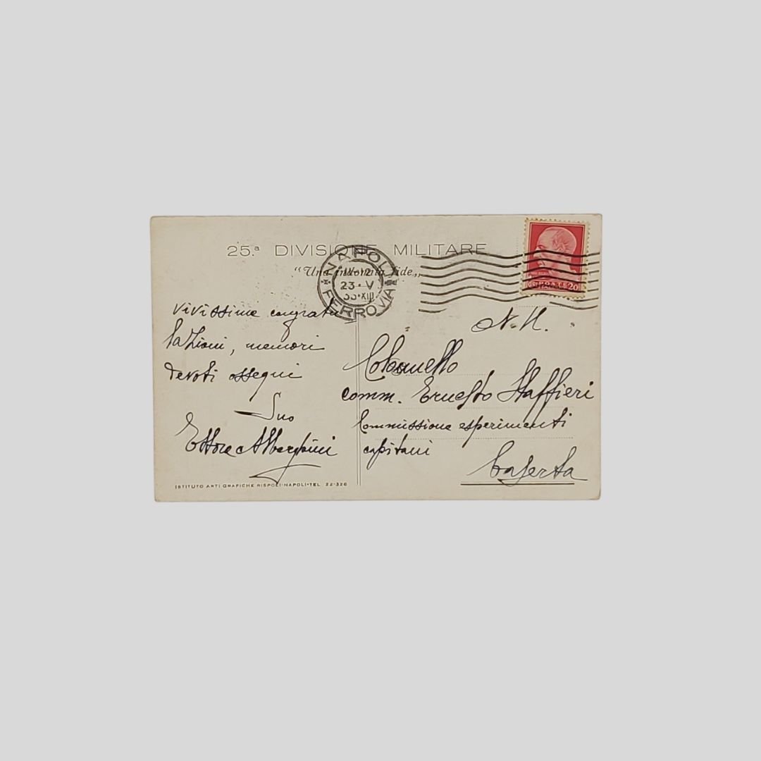 cm 14×9. Cartolina d’epoca. Viaggiata. Francobollo, timbro, postalizzata il 23/5/1933. Insignificanti tracce d’uso agli angoli. La 25a divisione ebbe origine a Napoli, inizialmente come XXV Brigata di Fanteria, parte della 25ª Divisione Territoriale di Napoli. Successivamente, nel 1939, divenne la 25ª Divisione fanteria “Bologna”.