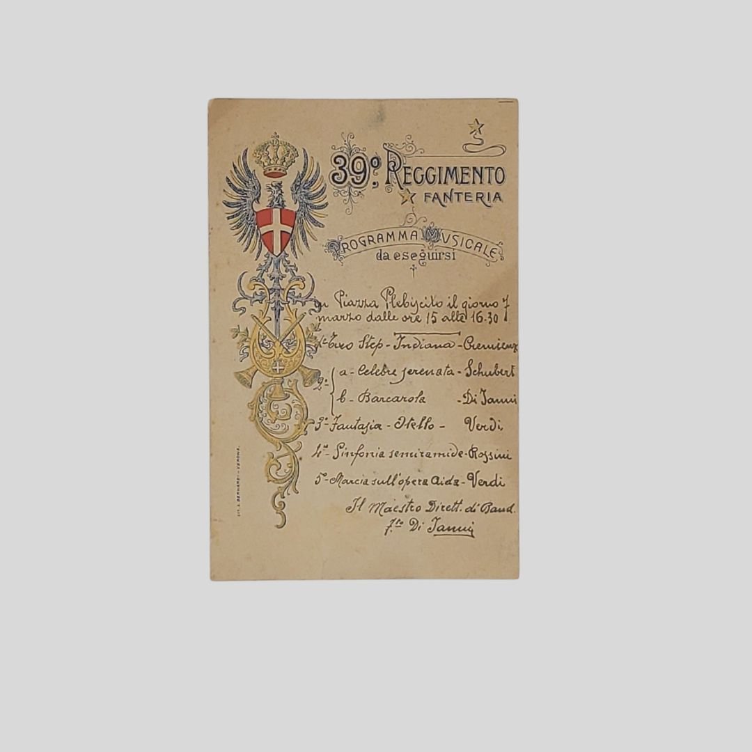 cm 9x14. Cartolina cromolitografica, non viaggiata. Programma musicale da eseguirsi il giorno 7 marzo in Piazza del Plebiscito (Napoli). Brani di Schubert, Di Ianni, Verdi, Rossini, Verdi. Maestro direttore di Banda Di Ianni. Il 39° Reggimento Fanteria ebbe sede in Napoli dal 1920 al 1926