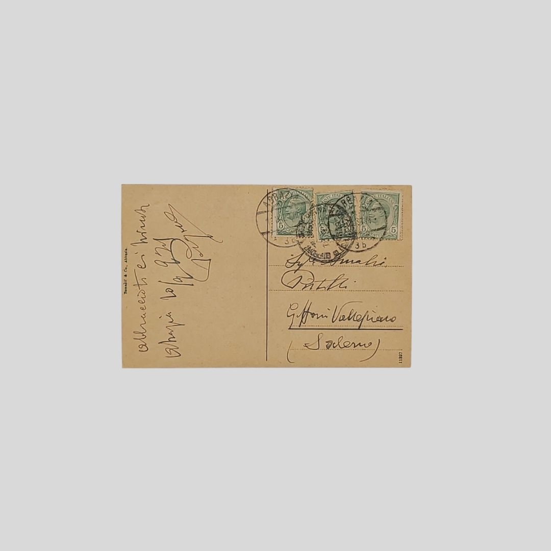 cm 14×9. Cartolina d’epoca. Viaggiata, invio del 20/9/1921. Timbri, francobolli. Tracce d’uso.