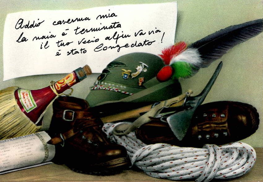 Addio caserma mia, la noia è terminata il tuo vecio alpin va via, è stato congedato.