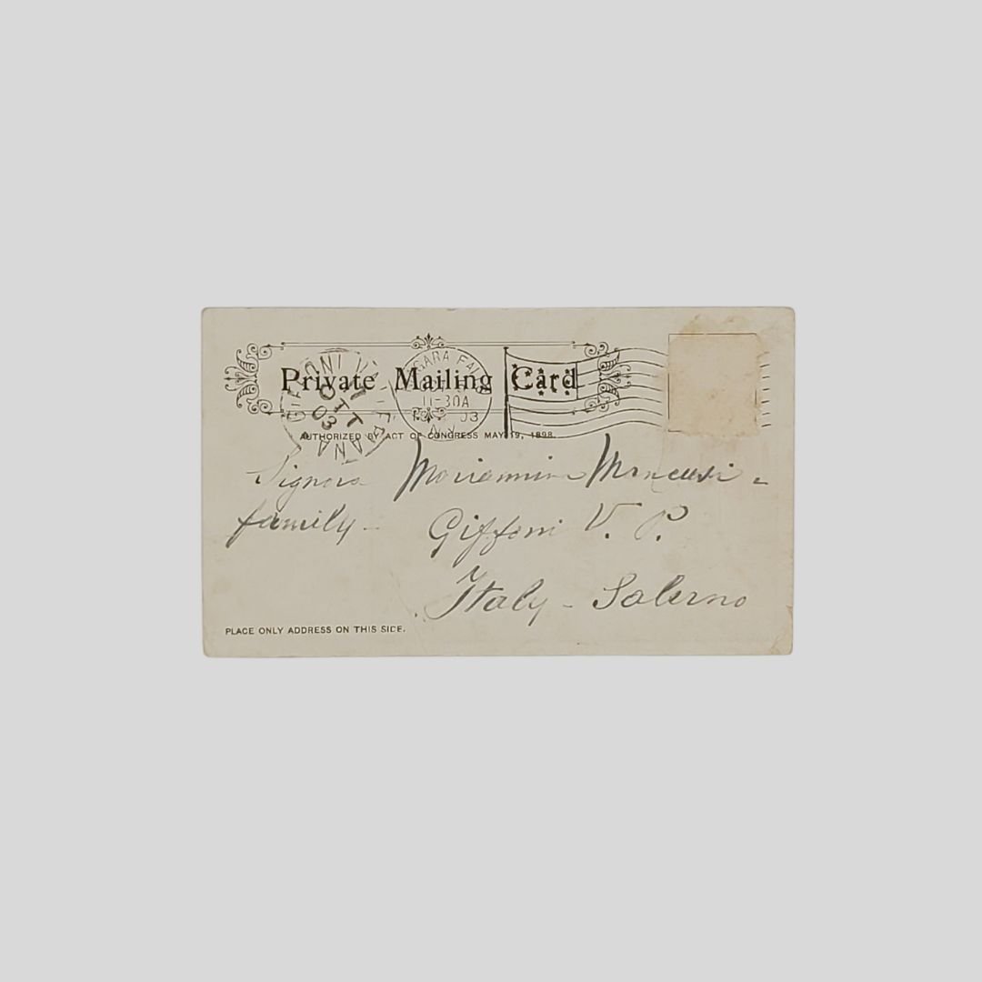 cm 8,2×14. Undivided back. Cartolina d’epoca. Viaggiata. Timbri, francobollo asportato, postalizzata il 17/10/1903. Tracce d’uso agli angoli.