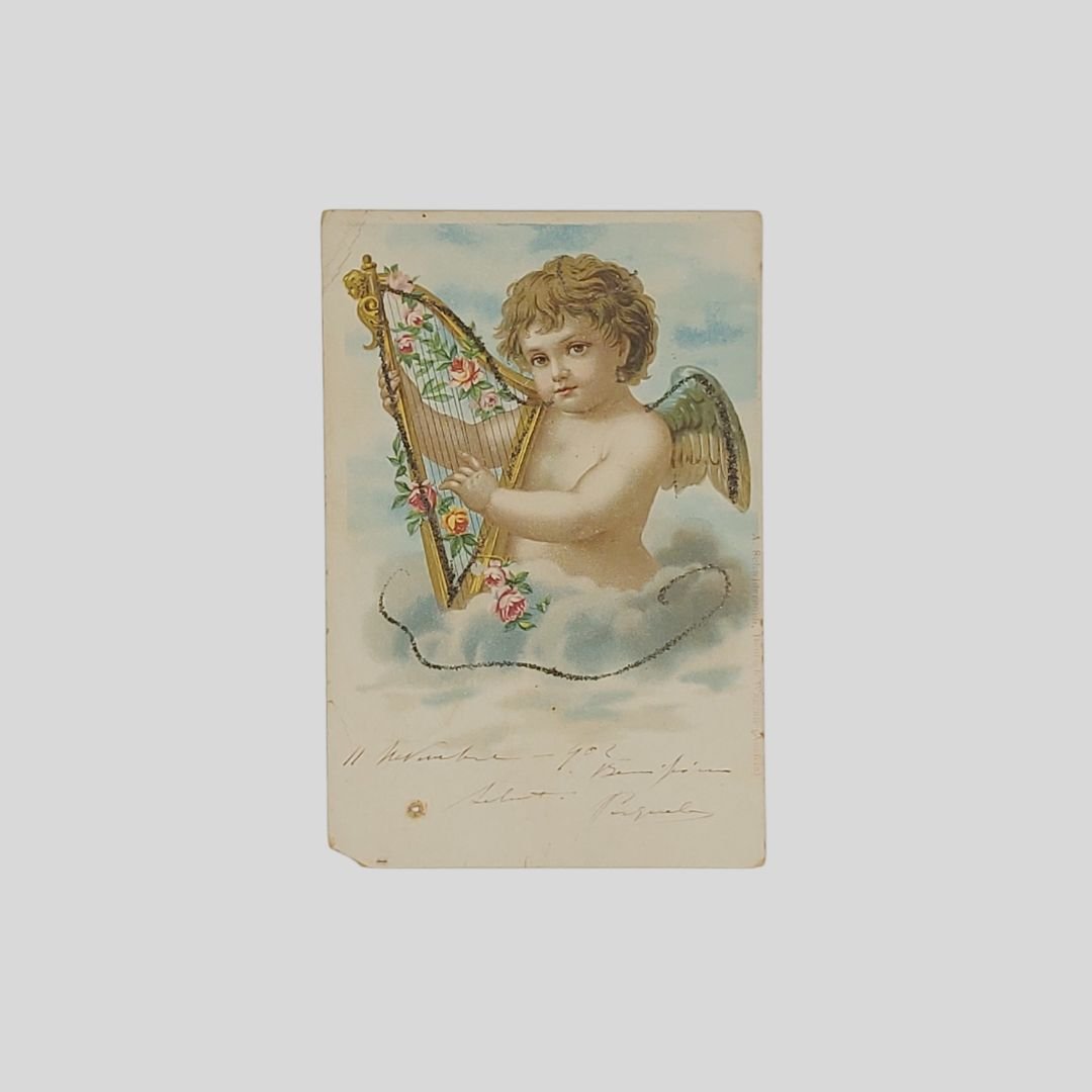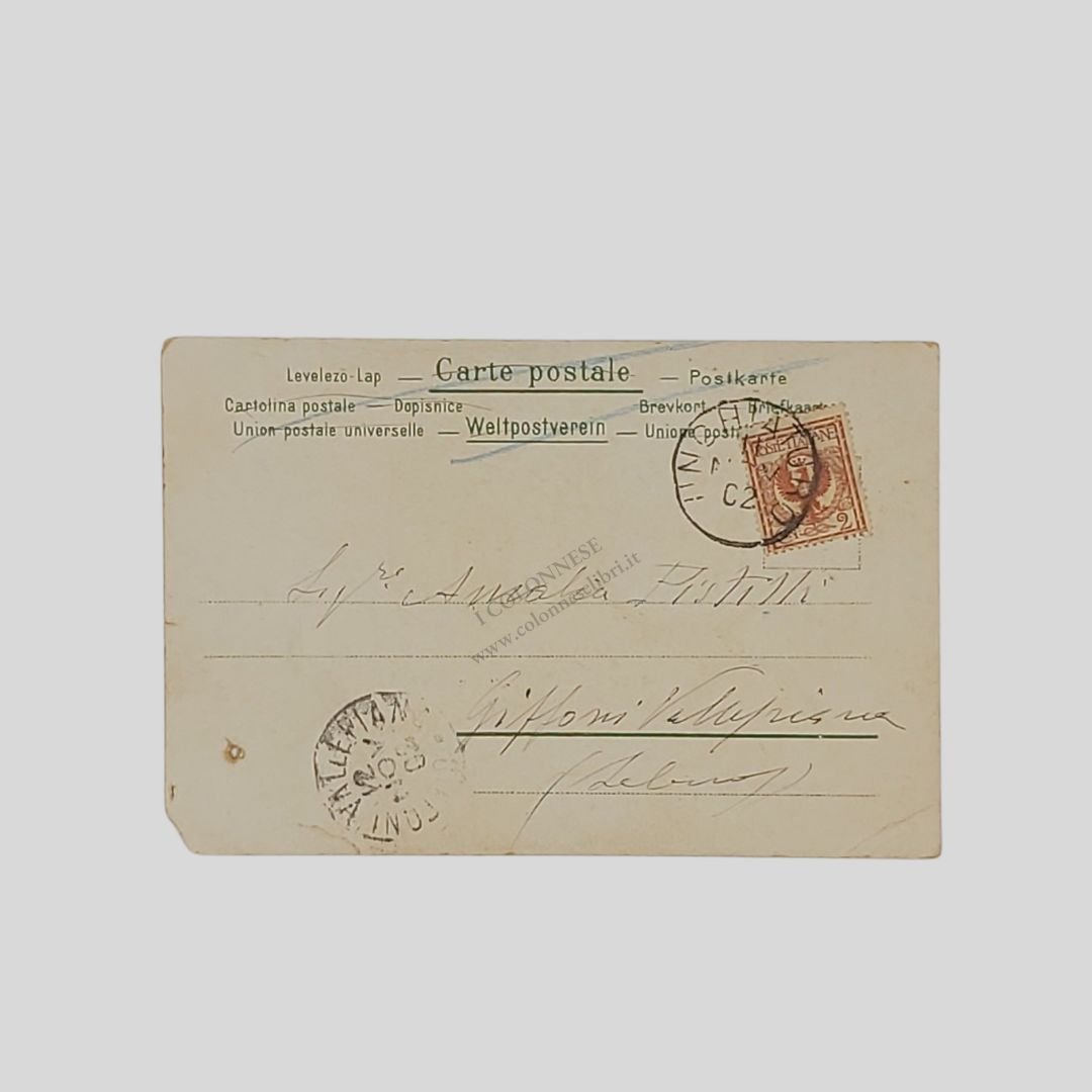 Undivided back. Cartolina d’epoca impreziosita ai margini con brillantini che ne restituiscono un certo luccicore a rilievo. Viaggiata, cm 9×14. Francobollo, timbri, postalizzata il 12/11/1902. Tracce d’uso agli angoli, buchetto, mancanza all’angolo inferiore sinistro, piega all’angolo superiore sinistro