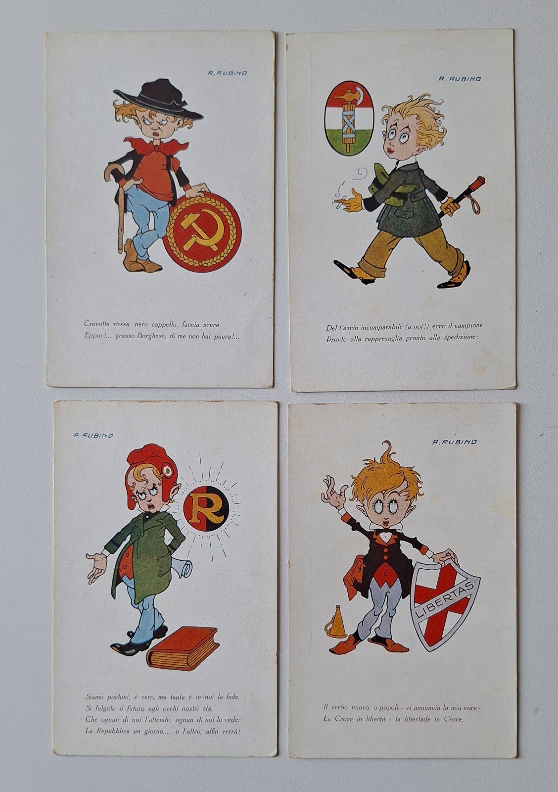 ANTONIO RUBINO 4 CARTOLINE PARTITI POLITICI Cm. 14 x 9, ill. a colori, non viaggiate, retro pulito.In ottime condizioni, lievissimi segni del tempo.TUTTI I NOSTRI LIBRI SONO VISIBILI PREVIO CONTATTO MAIL, TELEFONO O WHATSAPP NELLA NUOVA SEDE DI MILANO: LIBRERIA COSMOPOLIS, VIA JOMMELLI 22, MILANO.3313109672
