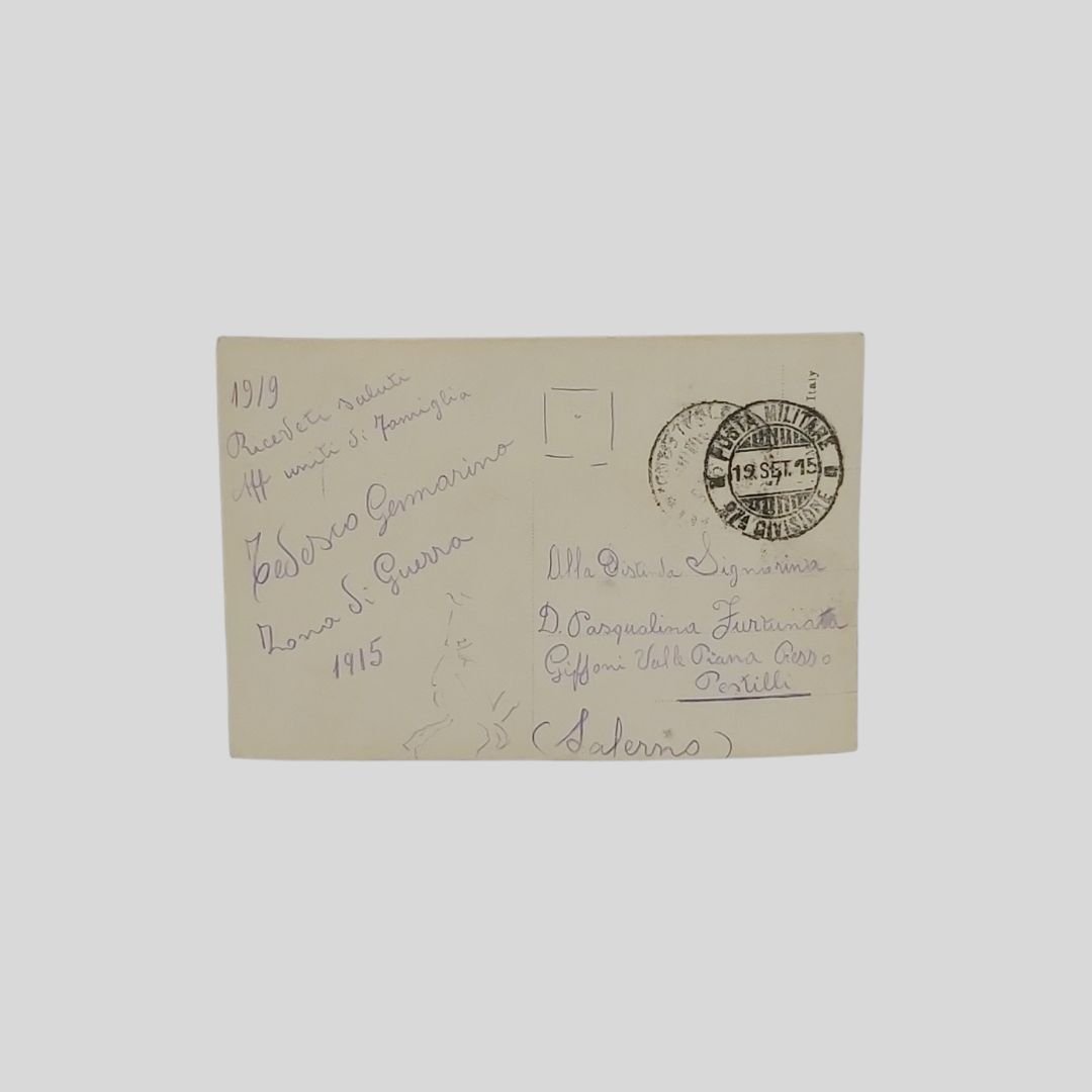 Cartolina fotografica d’epoca. Viaggiata, 19/19/1915, cm 9×13,5. Franchigia militare. Bollo di posta militare (87a Divisione) di stanza nella zona di Monfalcone. Lievemente ondulata ma in buone condizioni.