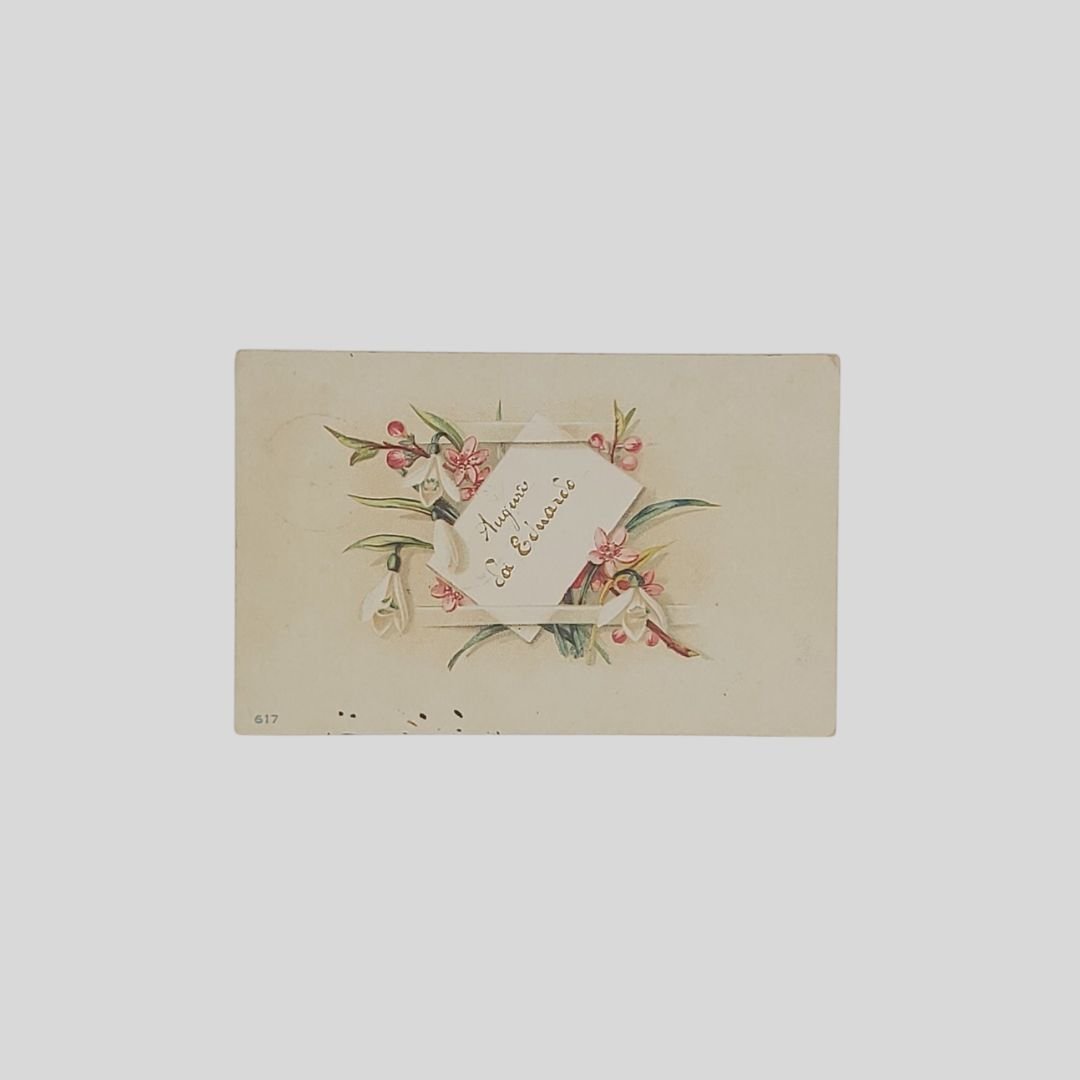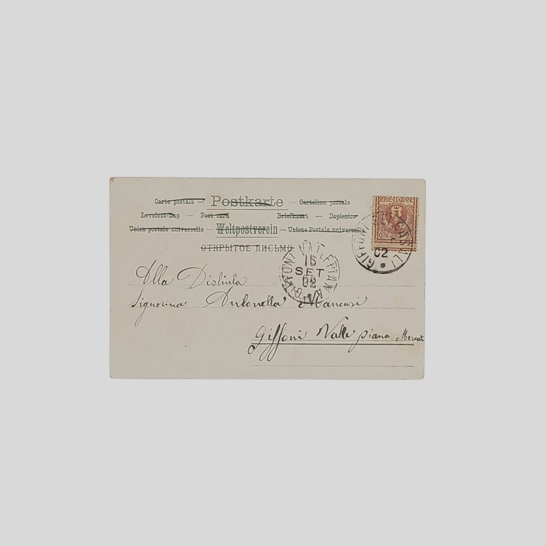 Cartolina augurale d’epoca, personalizzata con il nome del mittente. Undivided back. Viaggiata, cm 9×14. Francobollo, timbri (15/9/1902). Tracce d’uso, ma in buone condizioni. Non comune. Serie 617.