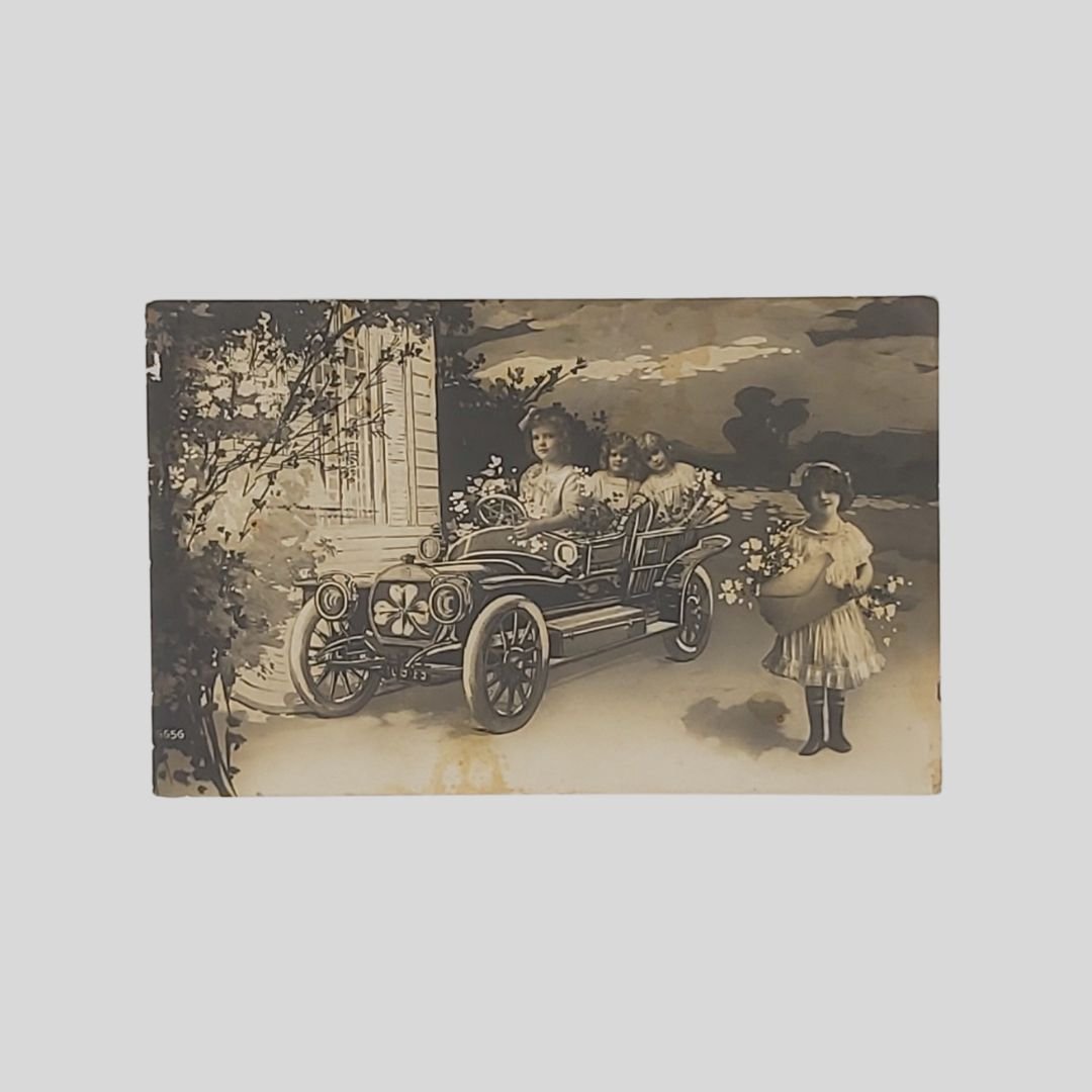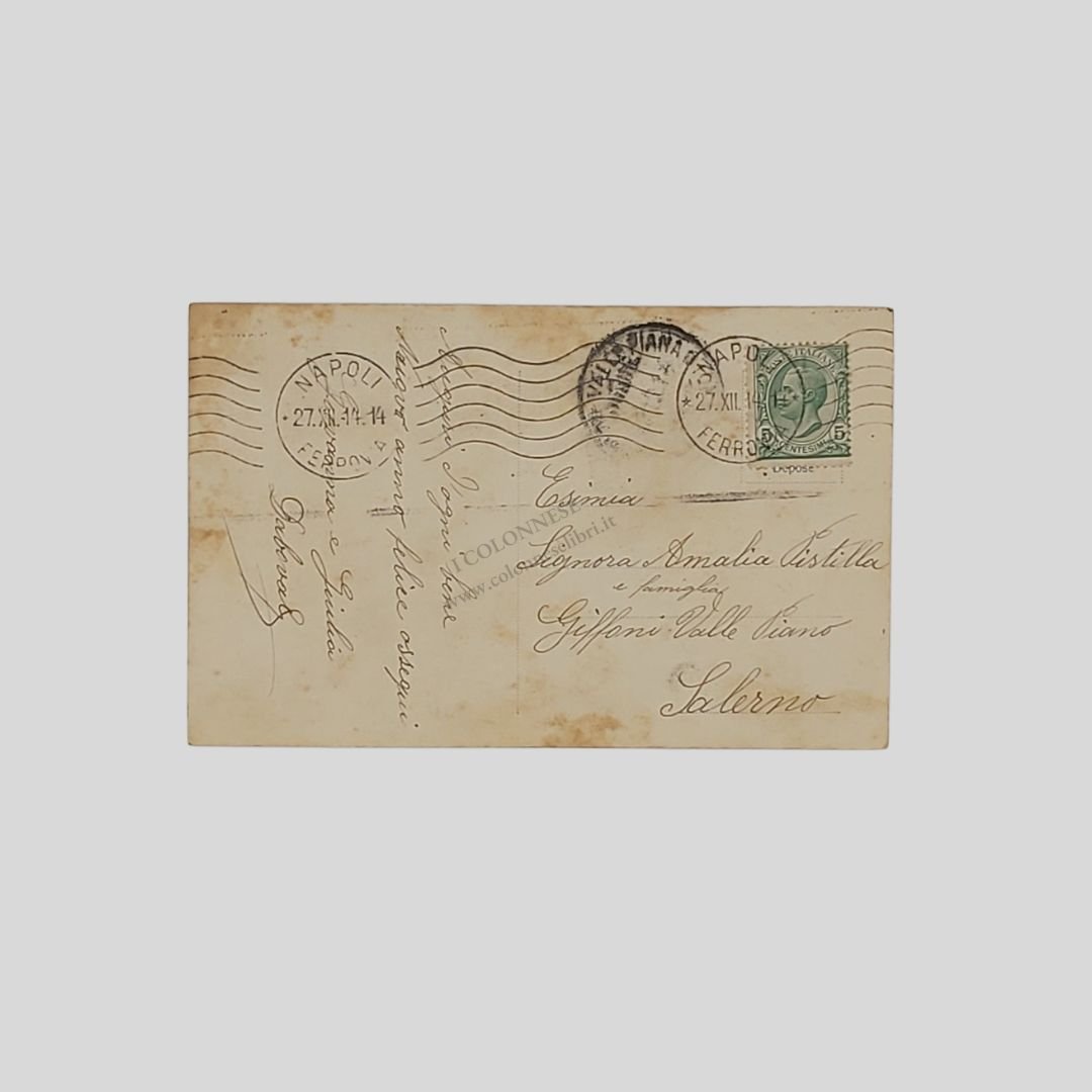 Cartolina fotografica d’epoca. Viaggiata, cm 13,5×8,5. Francobollo, timbri, postalizzata il 27/12/1914. Tracce d’uso e aloni. Liev. ondulata. Non comune.