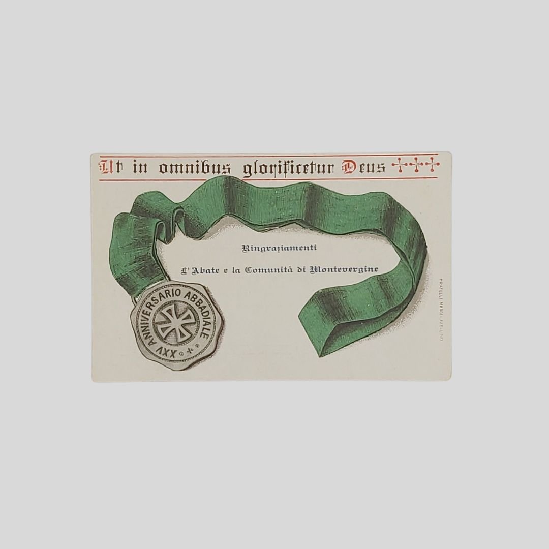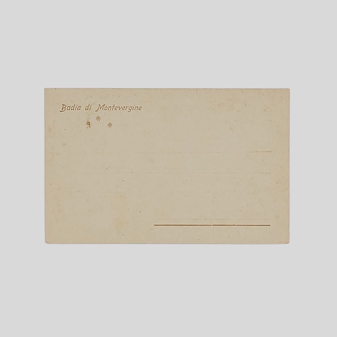 cm 14x9. Cartolina litografica, commemorativa d’epoca. Undivided back. Non viaggiata. Molto rara. Cartolina di ringraziamento dell’Abate e della Comunita di Montevergine, in occasione del XXV Anniversario Abbadiale. “Ut in omnibus glorificetur Deus”. Vittore Enrico Maria Corvaia, nato a Palermo il 19 giugno 1834, resse l’Abbazia di Montevergine dal 1879 al 1908. A soli dodici anni fu probando presso il monastero di S. Nicolò l’Arena in Catania dove vestì per la prima volta l’abito monastico. Si trasferì poi a Subiaco dove, nel 1858, fu ordinato sacerdote. Nel 1879 a Montevergine divenne dapprima coadiutore dell’abate Guglielmo De Cesare che, come buon conoscitore di uomini, lo scelse per affiancare il vicario generale Giambattista Coscinà negli affari diocesani ed affinché si rendesse conto di tutto l’ambiente dell’abbazia di Montevergine. A contraddistinguere il religioso fu il fascino verso il culto divino; per tale ragione fece erigere la Via Crucis a Montevergine, curò particolarmente gli altari e la conservazione delle sacre reliquie, che furono rimosse dalla cappella di san Michele e riunite tutte in quella di san Guglielmo. L’abate Corvaia si occupò anche degli opportuni ornamenti, lasciandone il ricordo in una iscrizione marmorea. Nel 1908 un breve pontificio lo nominava vescovo titolare di Tripoli sicché, dopo la consacrazione episcopale avvenuta nella cattedrale di Montevergine, poté fare la consegna dell’abbazia al suo successore, l’abate Gregorio Grasso. Morì il 22 luglio del 1913.<BR>La Candelora, una delle festività più sentite nel culto della Madonna di Montevergine, chiamata anche Mamma Schiavona: si narra che nel 1200, durante una bufera di neve, una coppia di amanti omosessuali fosse stata scoperta ed imprigionata contro un albero sul monte con delle lastre di ghiaccio: per intercessione della Vergine, un improvviso raggio di sole colpì il ghiaccio, sciogliendolo e salvando i due innamorati. Da quel giorno, ogni anno, in occasione di tale festività, gay, lesbiche e transessuali, rendono omaggio alla Mamma Schiavona con un pellegrinaggio al santuario, chiamata «juta dei femminielli», per poi partecipare, insieme agli altri pellegrini, alle danze, soprattutto tammorriate, che si svolgono nel piazzale antistante, il santuario.